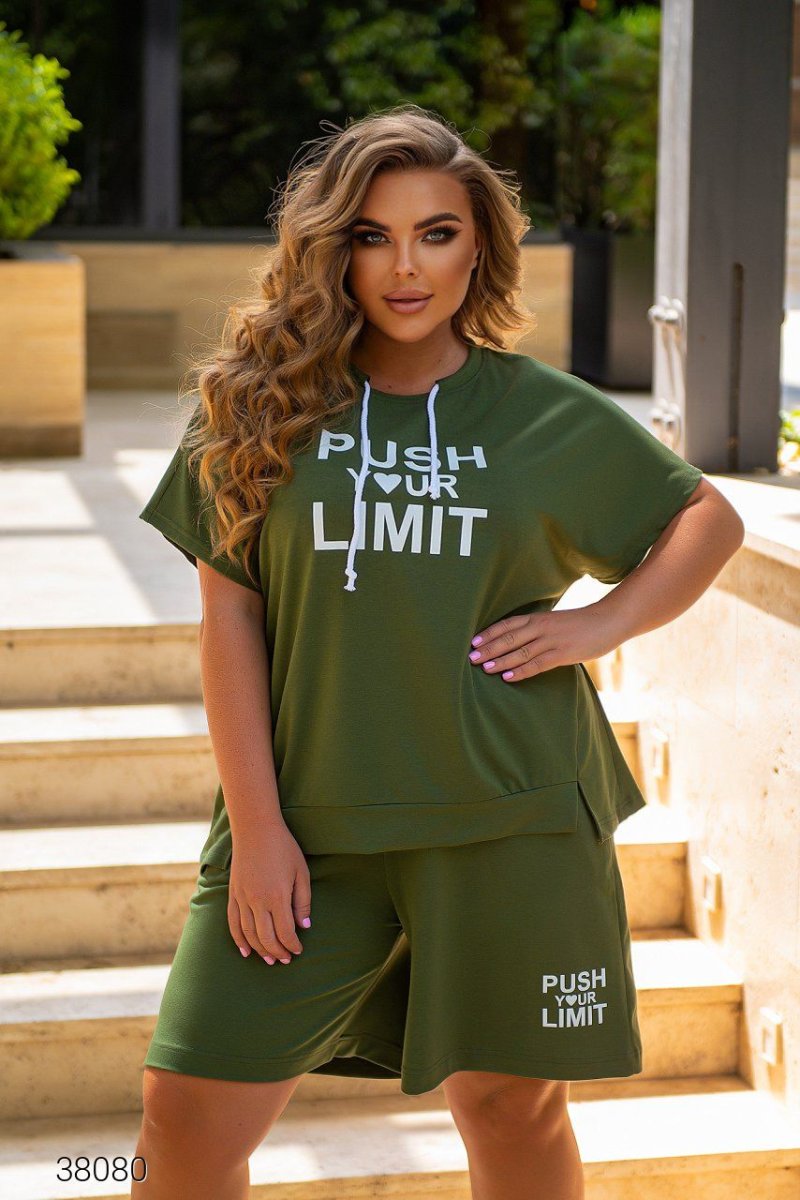 Прогулочный костюм с шортами. Футболка свободного кроя, декорирована накатом и х/б шнурком. Шорты свободного кроя с высокой посадкой, пояс резинка, есть боковые карманы.