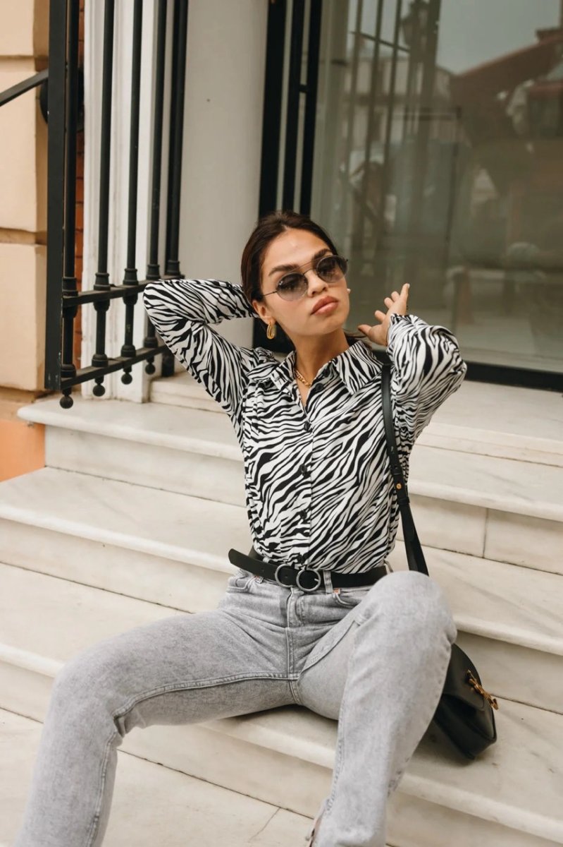 Фасон: прямой, свободный, с манжетами, с воротником рубашечного типа.