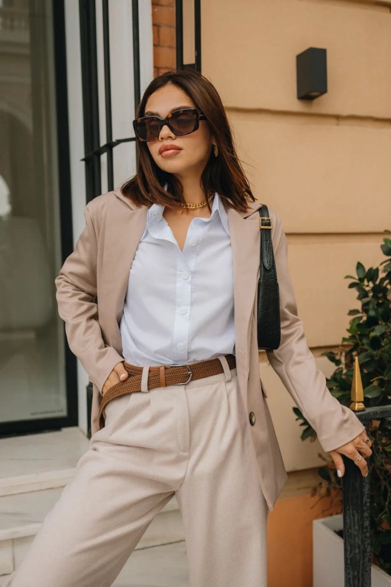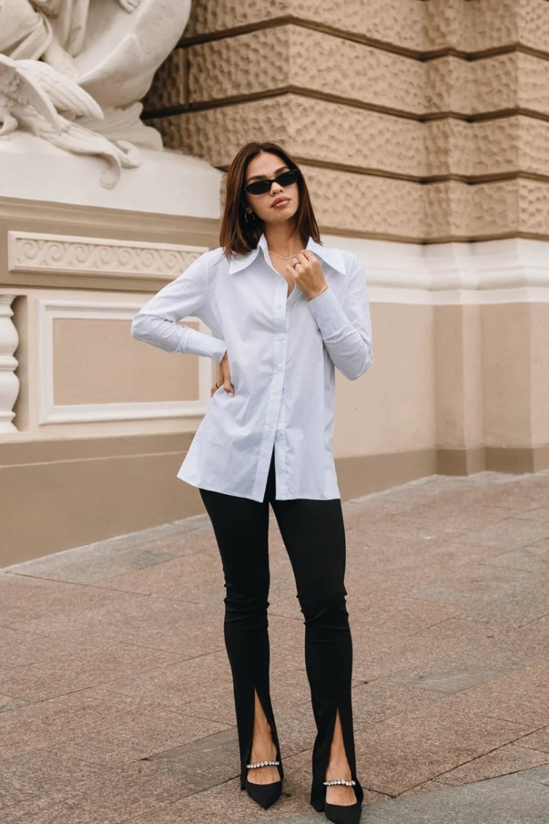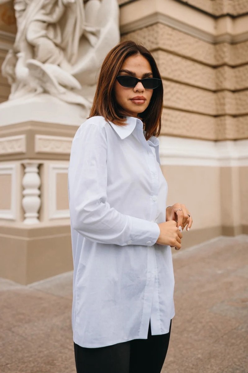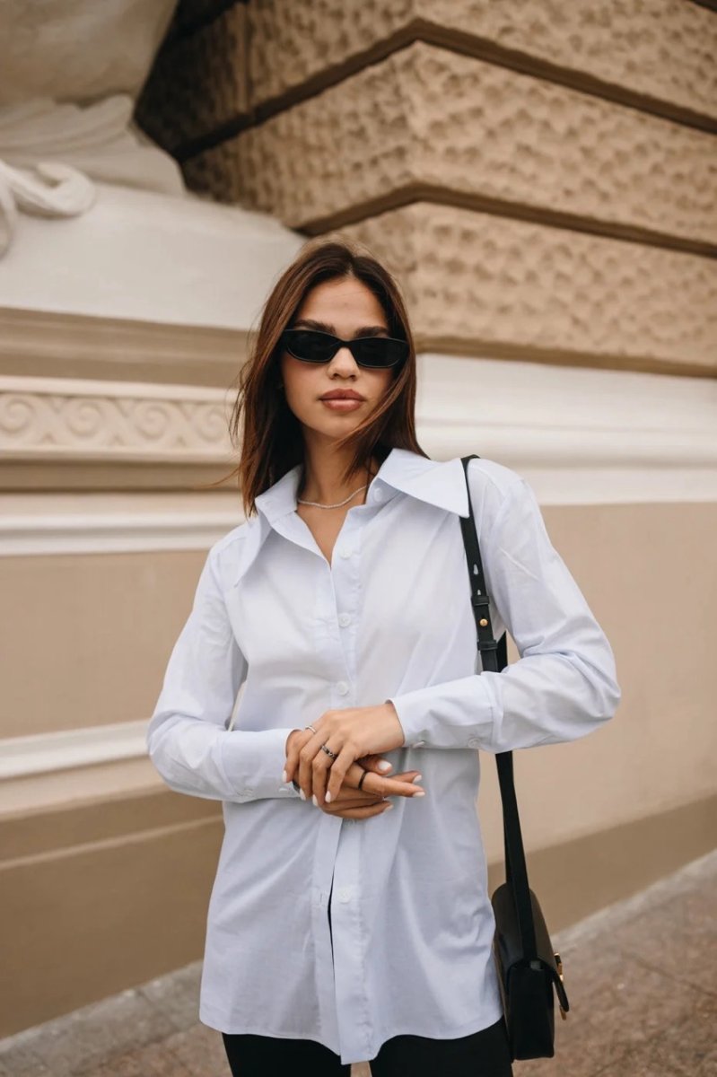 Фасон: прямой, свободный, с манжетами, с воротником рубашечного типа.