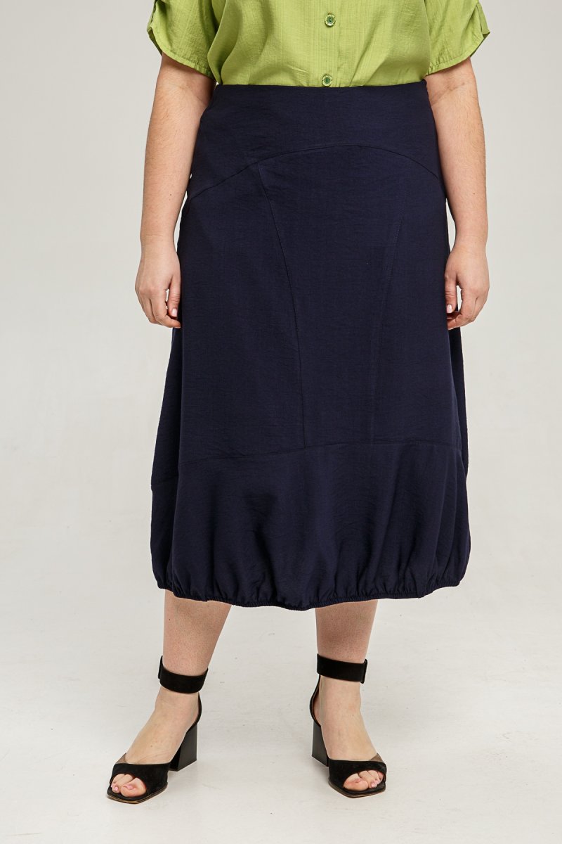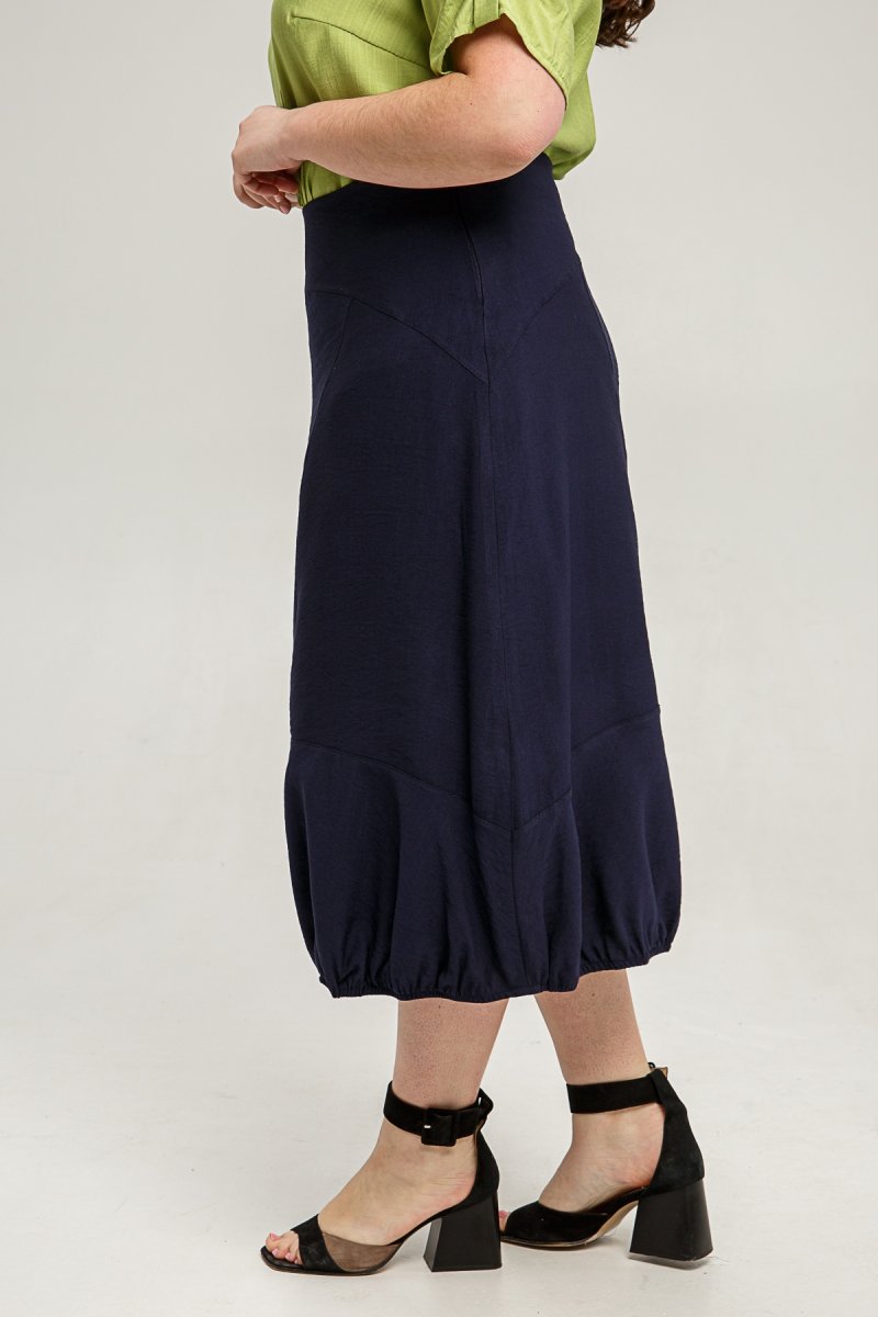 Юбка клешеная, внизу собрана на резинку. Выполнена из жатого льна. Ткань слегка сжатая, более мягкая и тоньше стандартного льна, не дает усадку. По переду и заду расположены фигурные кокетки. Застежка на тайную молнию.