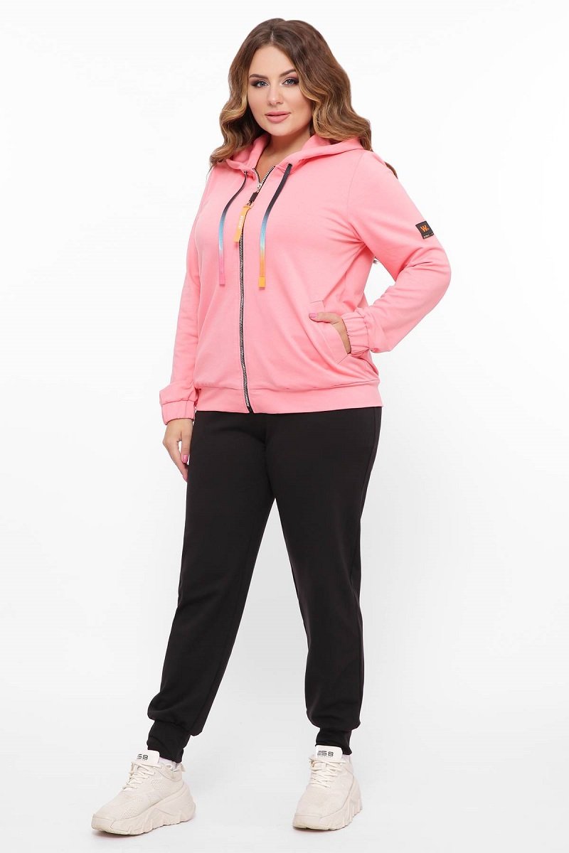 Спортивный костюм с капюшоном, исполнением из ткани (двунитка) – яркий верх и черные брюки. Кофта застегивается на молнию. По низу кофты, брюк и рукава широкая "резинка" (манжеты из основной ткани). На полочках косые вшивные карманы. Брюки заужены к низу с косыми втачными карманами. На талии резинка.