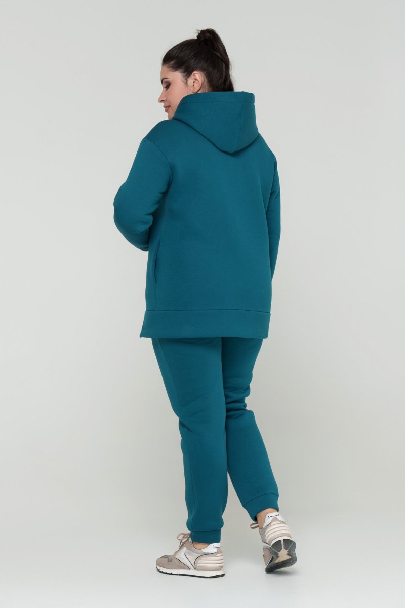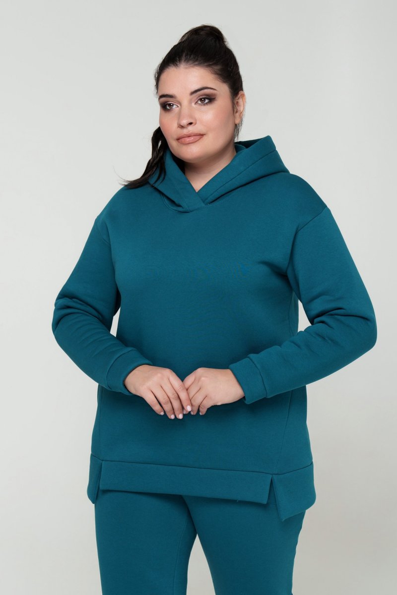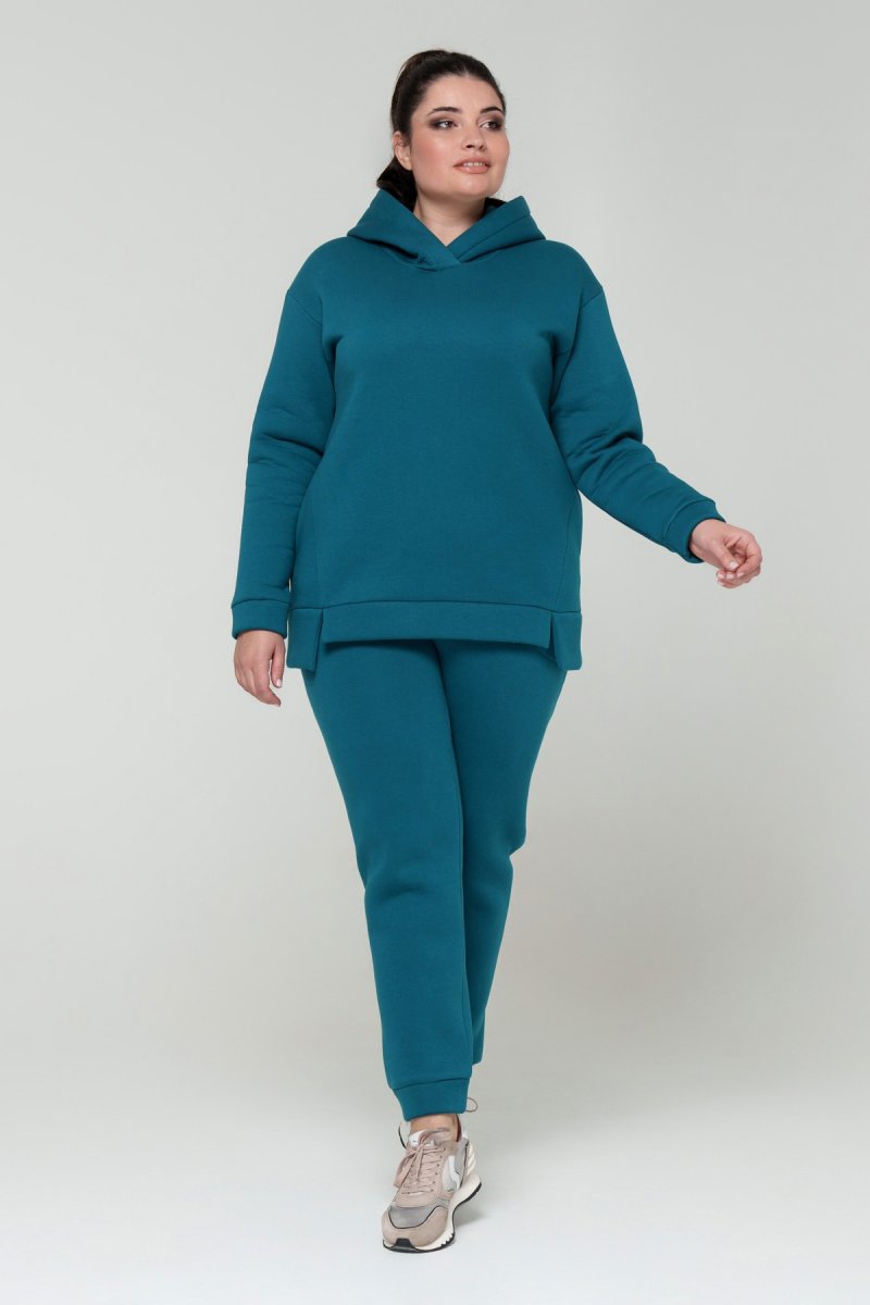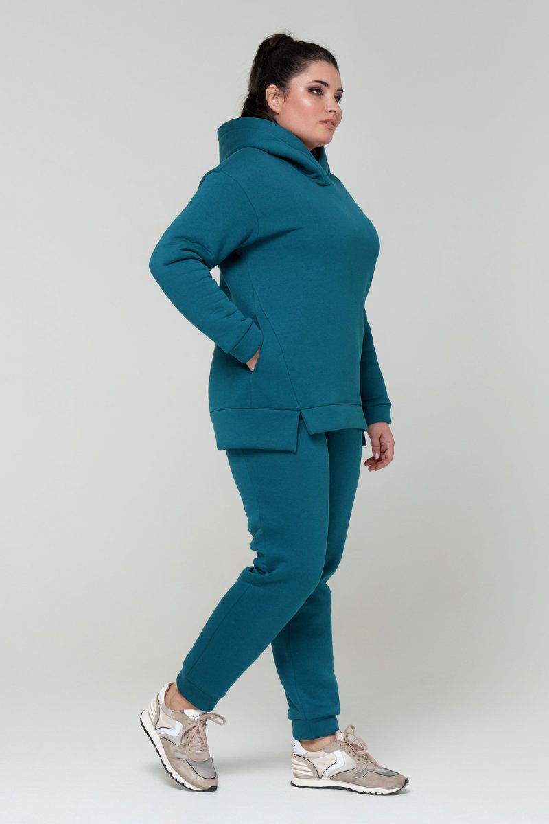Джемпер прямого силуэта с капюшоном. Рукав втачной на спущенной пройме. Низ джемпера с притачной планкой и разрезами. В боковых швах карманы. Брюки с высокой посадкой на эластичном поясе, спереди карманы. По низу брюк отрезной манжет.