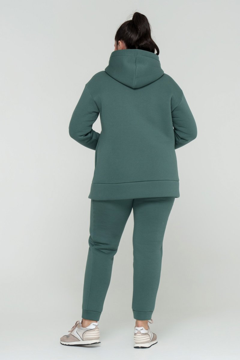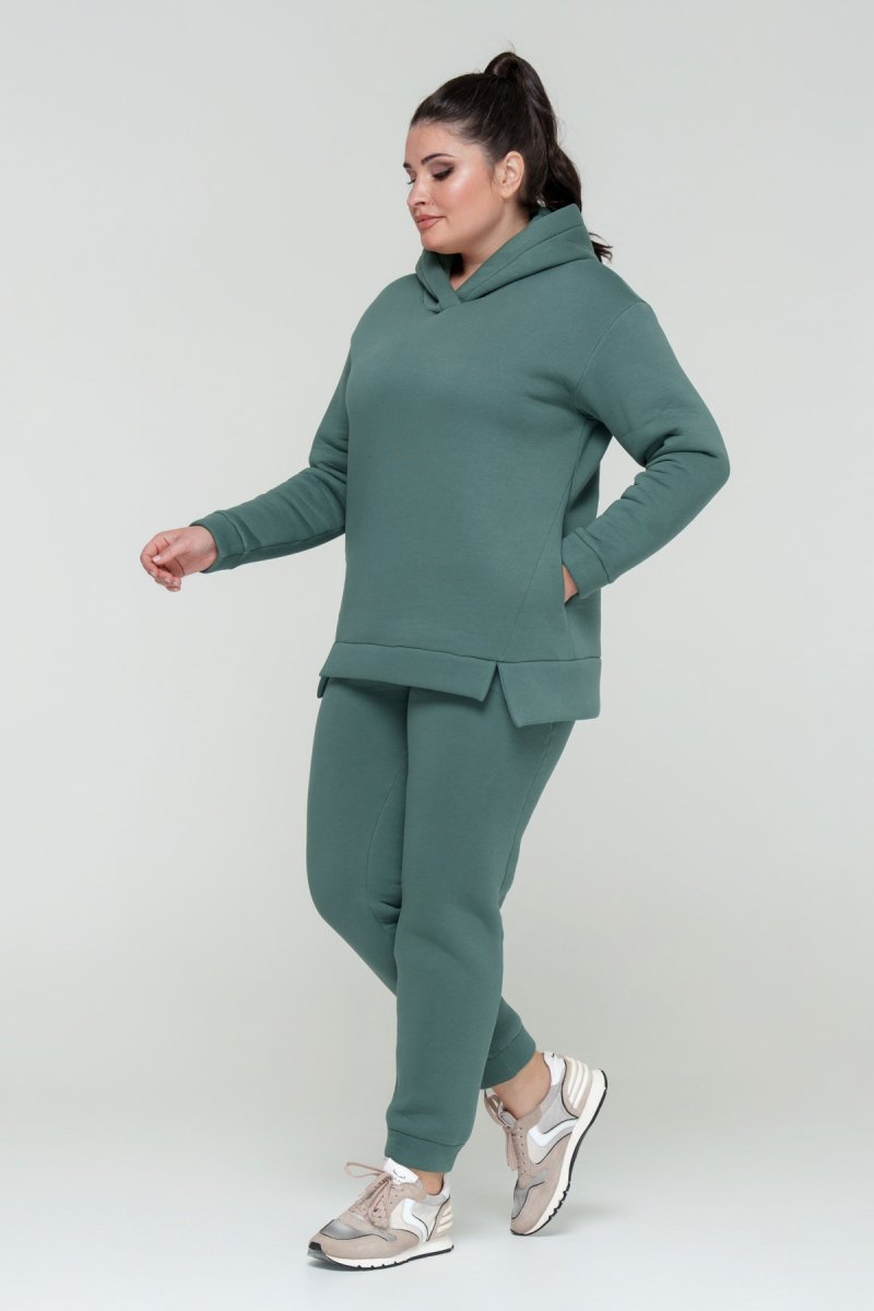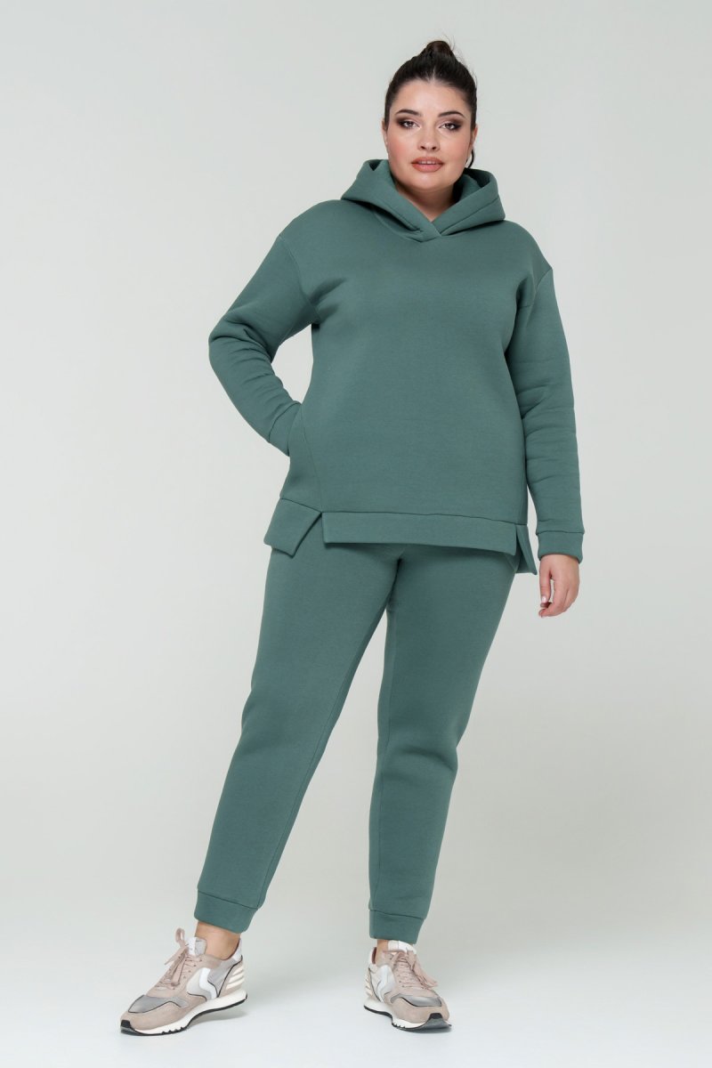 Джемпер прямого силуэта с капюшоном. Рукав втачной на спущенной пройме. Низ джемпера с притачной планкой и разрезами. В боковых швах карманы. Брюки с высокой посадкой на эластичном поясе, спереди карманы. По низу брюк отрезной манжет.