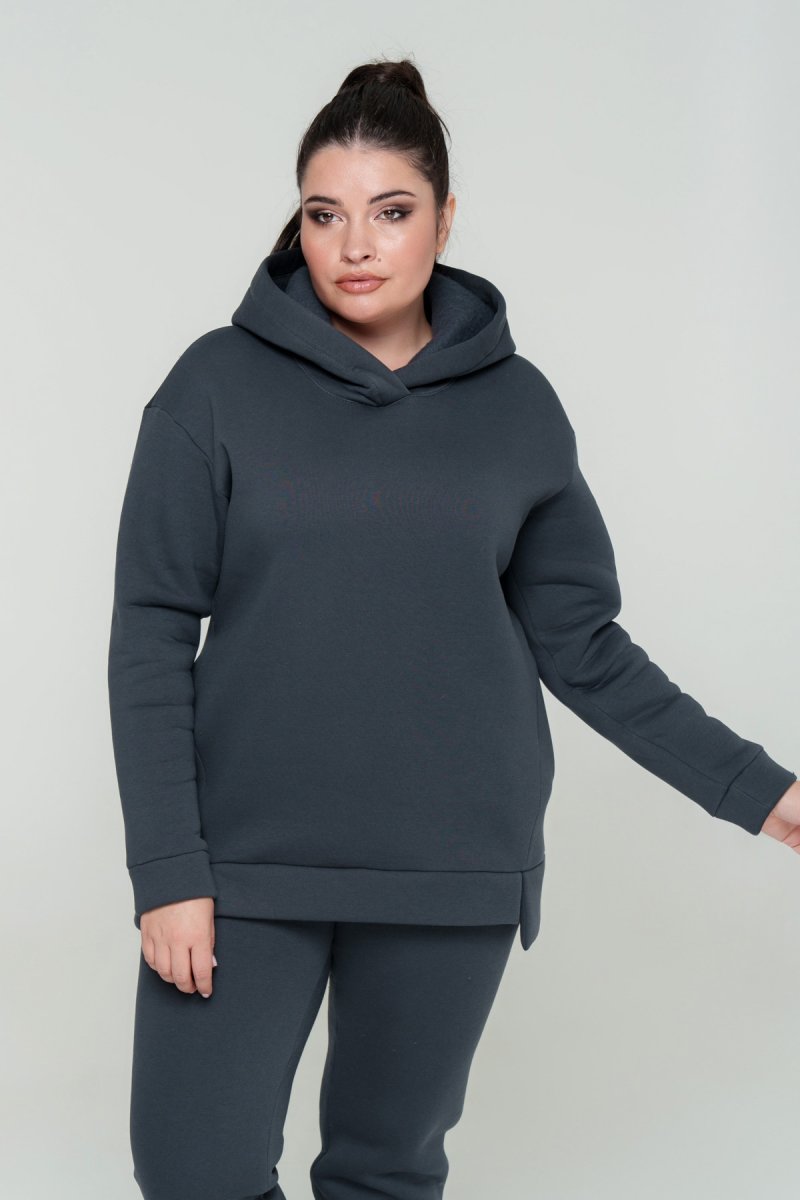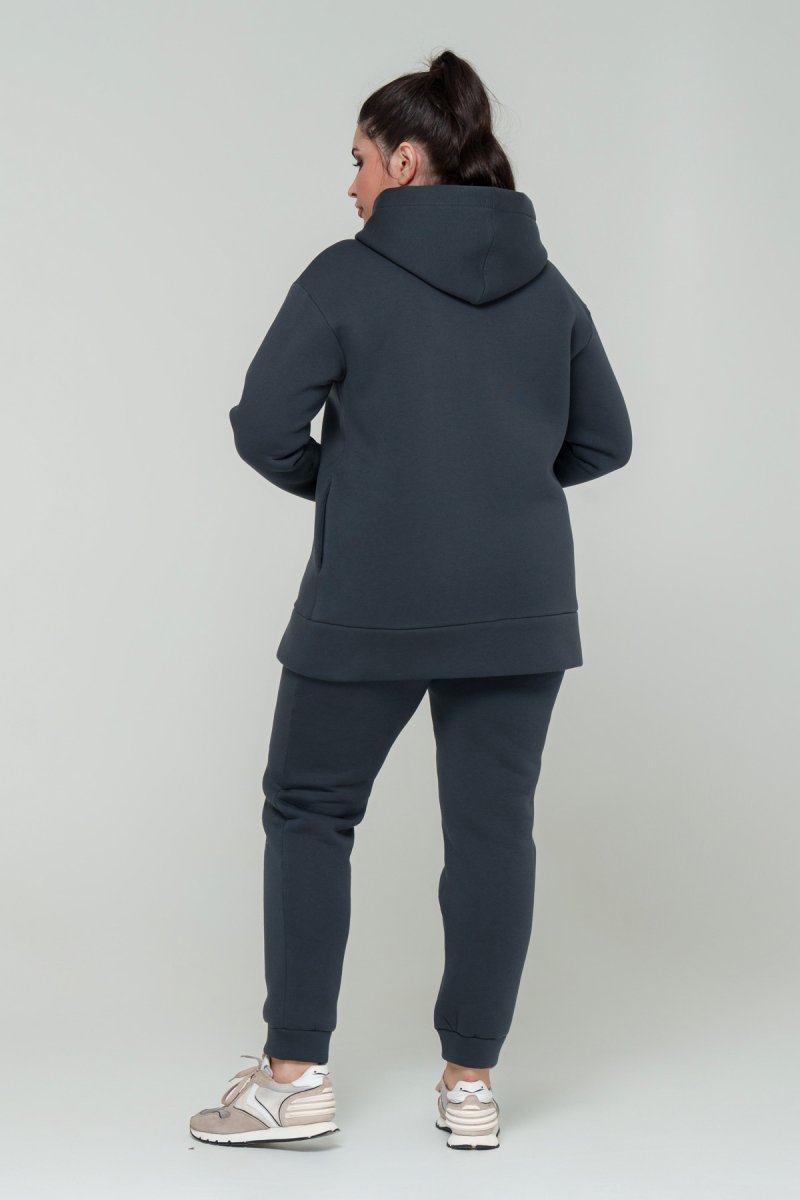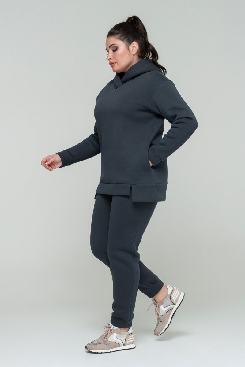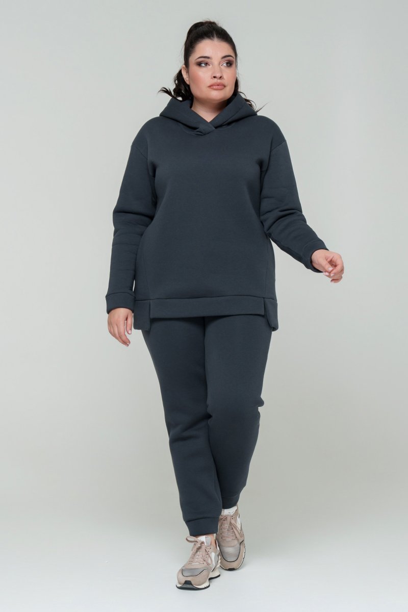 Джемпер прямого силуэта с капюшоном. Рукав втачной на спущенной пройме. Низ джемпера с притачной планкой и разрезами. В боковых швах карманы. Брюки с высокой посадкой на эластичном поясе, спереди карманы. По низу брюк отрезной манжет.