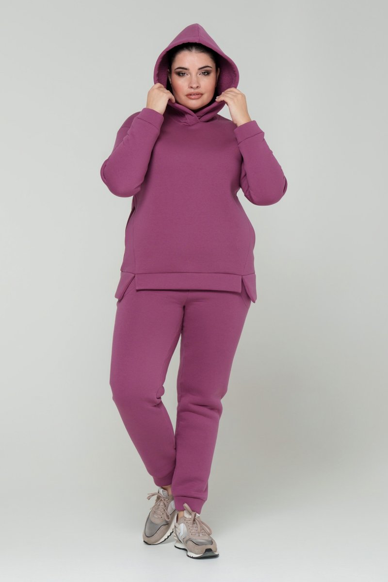 Джемпер прямого силуэта с капюшоном. Рукав втачной на спущенной пройме. Низ джемпера с притачной планкой и разрезами. В боковых швах карманы. Брюки с высокой посадкой на эластичном поясе, спереди карманы. По низу брюк отрезной манжет.