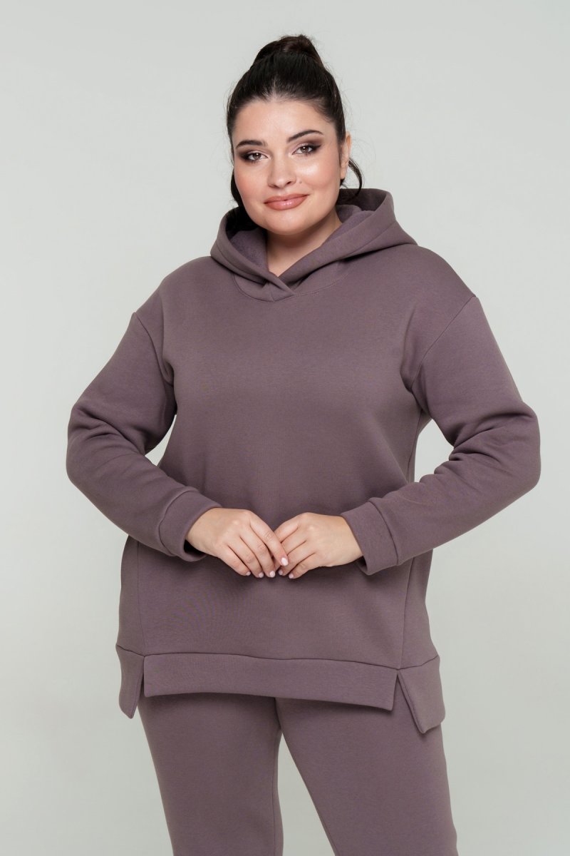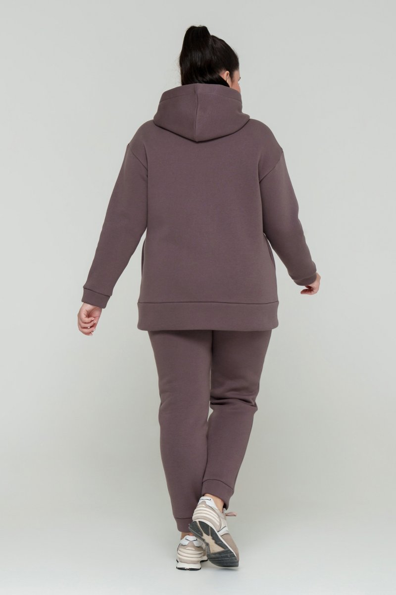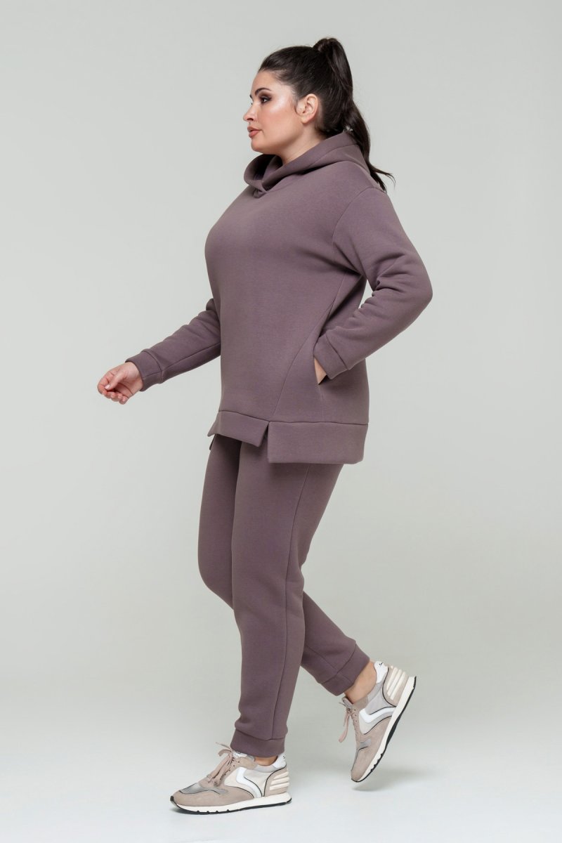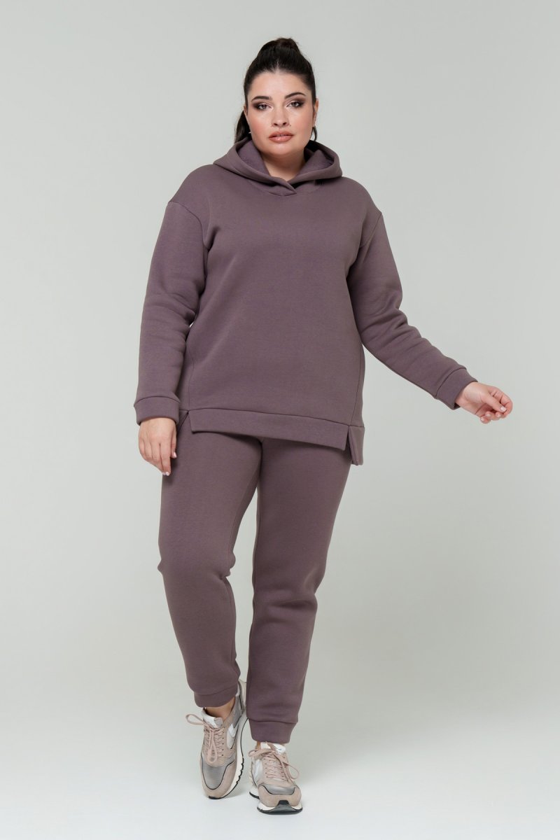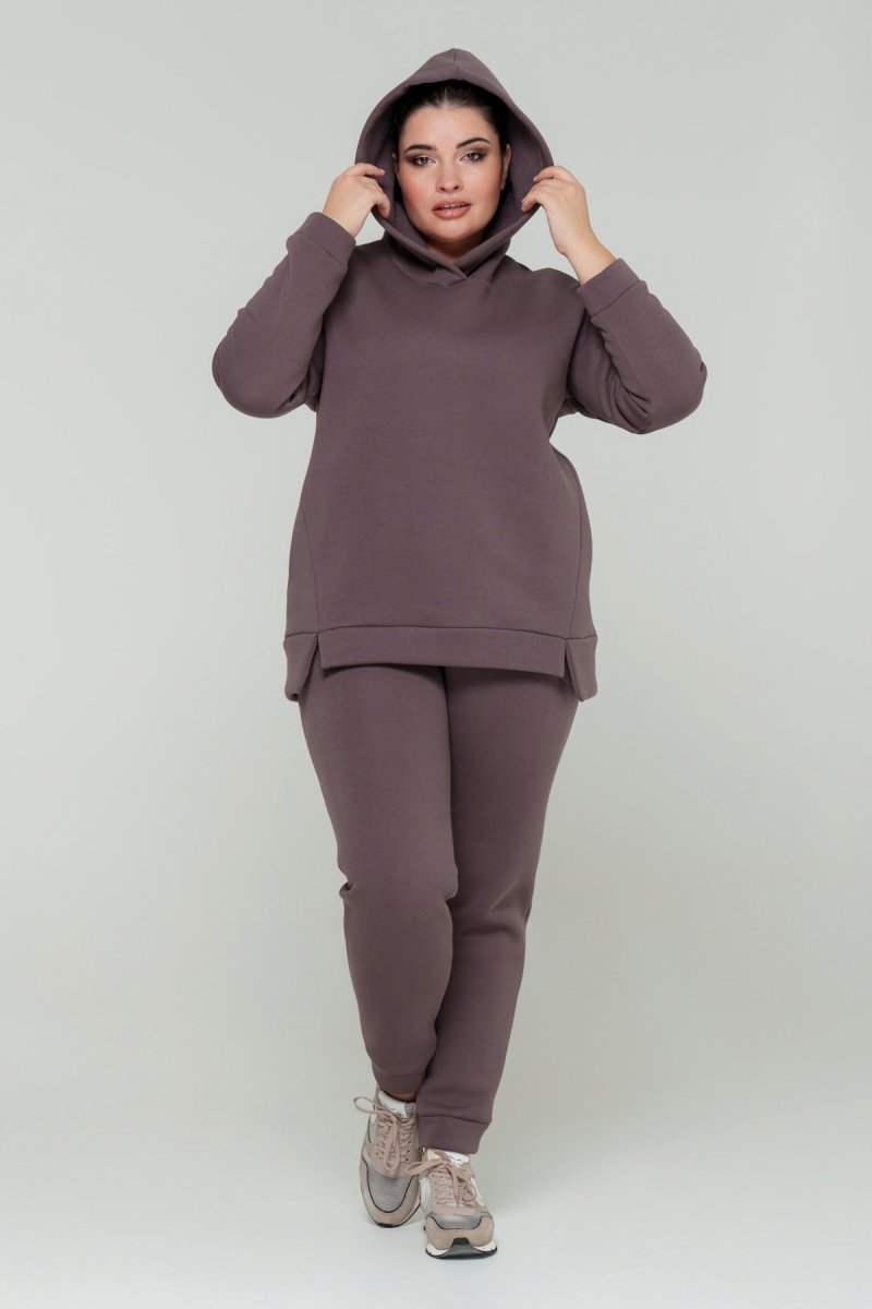 Джемпер прямого силуэта с капюшоном. Рукав втачной на спущенной пройме. Низ джемпера с притачной планкой и разрезами. В боковых швах карманы. Брюки с высокой посадкой на эластичном поясе, спереди карманы. По низу брюк отрезной манжет.