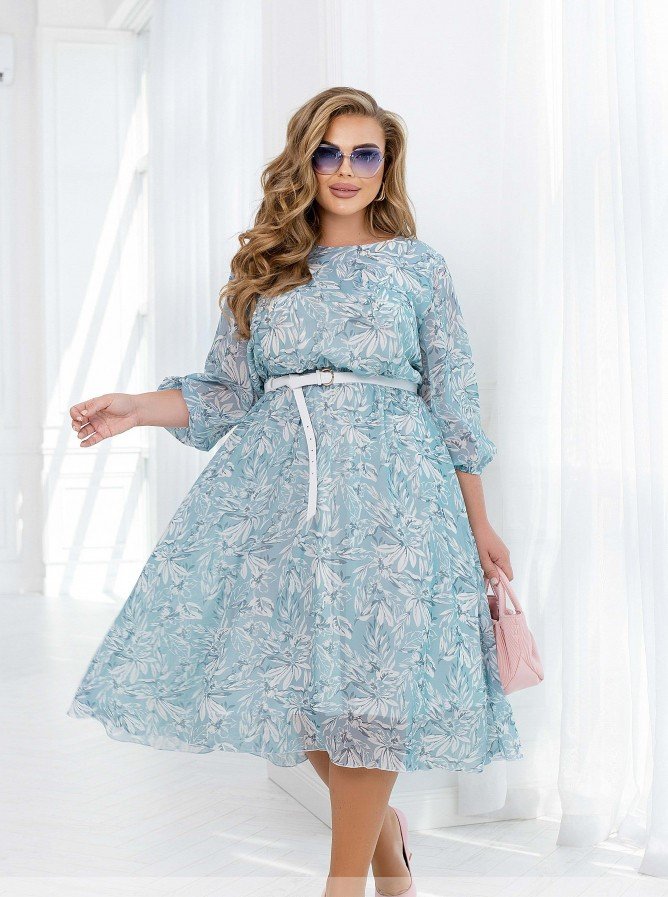 Это воздушное платье сделано из легкого шифона в цветочный принт. Она имеет полукруглый вырез горловины и отрезную линию талии, спадавшую плиссированными оборками, придавая платья легкости и грации. Платье состоит из двух слоев ткани, где верхний слой полупрозрачный шифон, а нижний слой мягкий и приятный на ощупь. Рукава платья длиной 3/4 не имеют подкладки, что обеспечивает его легкость и воздушность. На запястьях рукавов вшиты резинки, что придает платью объем и элегантность. Талия отрезная с вертикальными выточками, которые подчеркивают женственность фигуры и придают платьям дополнительного орнамента. А обрамить талию можно пояском, входящим в комплект. В этом платье Вы будете выглядеть нежно и женственно, оно прекрасно подойдет для летней прогулки или романтического свидания.