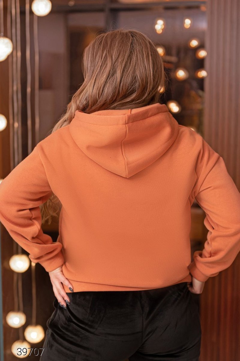 Худи с объёмным капюшоном из качественного трикотажа трёхнити с начёсом. Капюшон с затягивающимся шнурком, люверсы, наконечники. Заниженная линия плеч, накладной карман, эластичные манжеты и нижняя кромка.