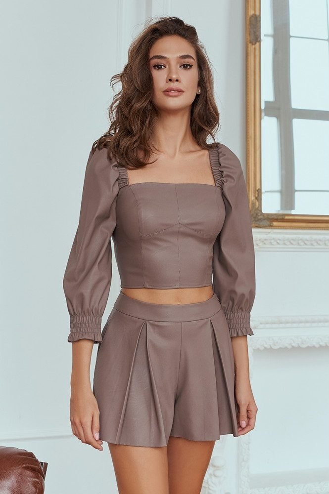 Топ из эко-кожи с вырезом каре. Рукава 3/4, манжеты на резинке. Сбоку потайная молния.