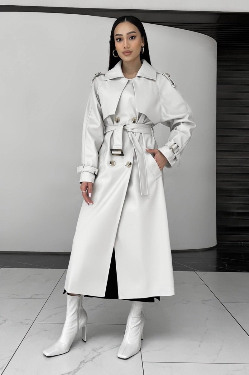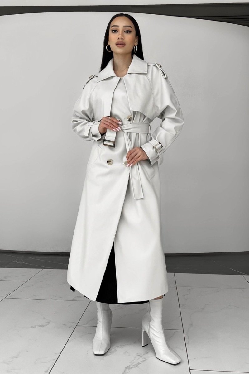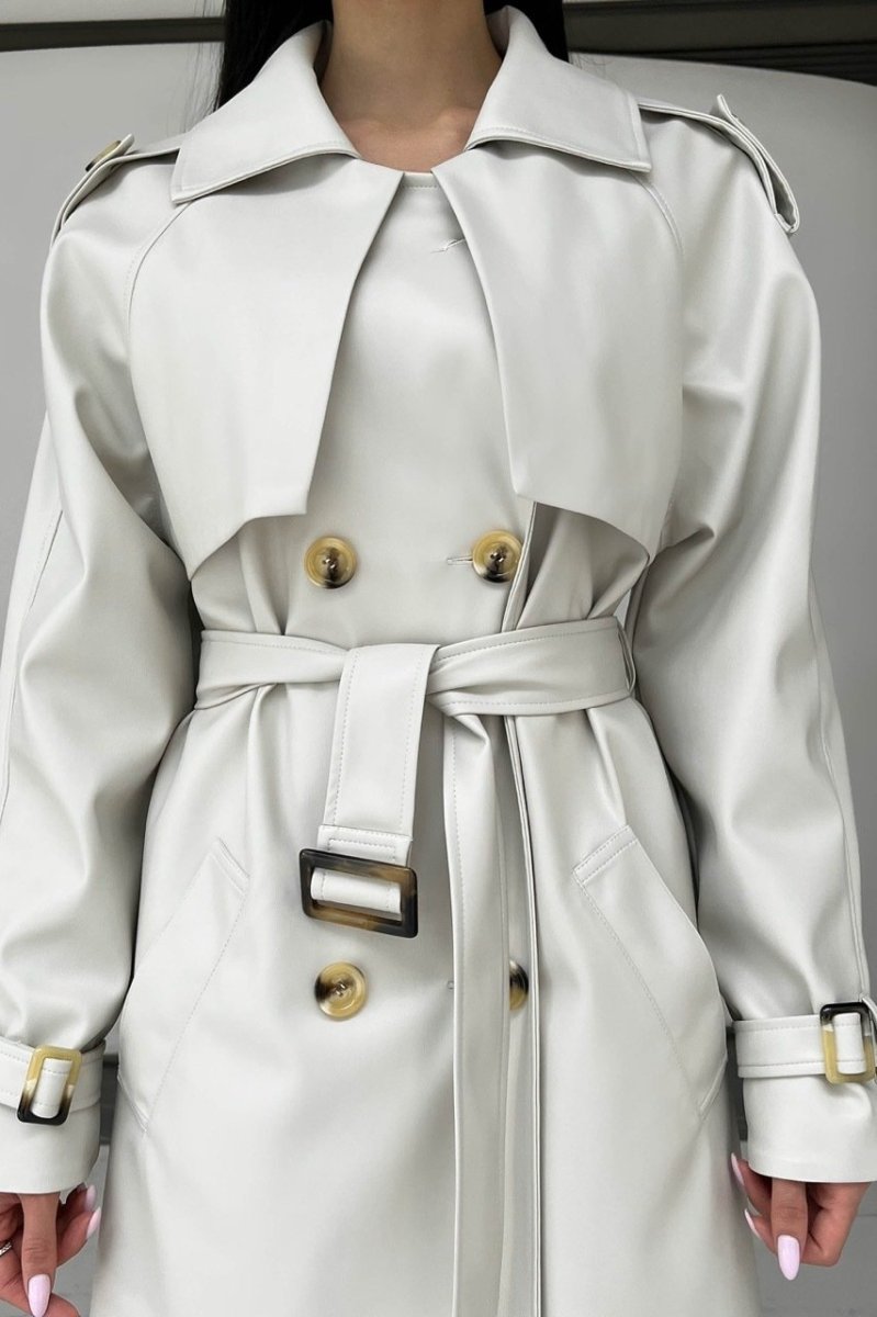 Для тренча выбрали гладкую и мягкую экокожицу. Тренч на подкладке, застегивается на объемные пуговицы. Модель дополнена оригинальными декоративными элементами – отлетные кокетки по переду и спинке, погоны на плечах.