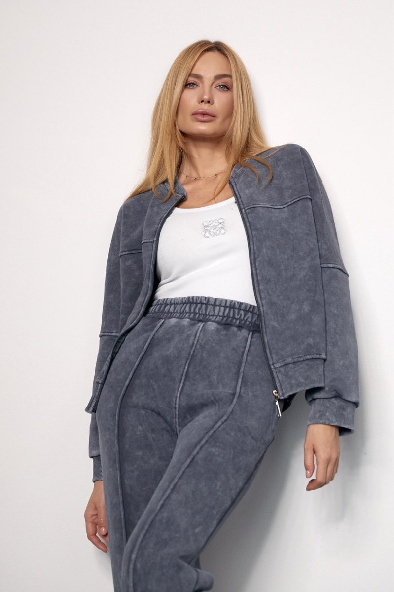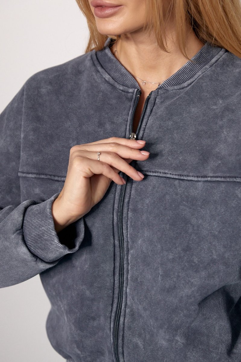 В кофте манжеты на рукавах и воротник-стойка на круглой горловине выполнены из рибаны в мелкий рубчик, а низ изделия дополнен трикотажным манжетом. Вверху изделия спереди и сзади расположены декоративные швы. Застегивается бомбер на металлическую молнию.