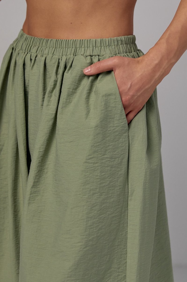 Эта модель имеет свободный крой, с прорезными карманами в боковых швах и на широкой резинке вверху.