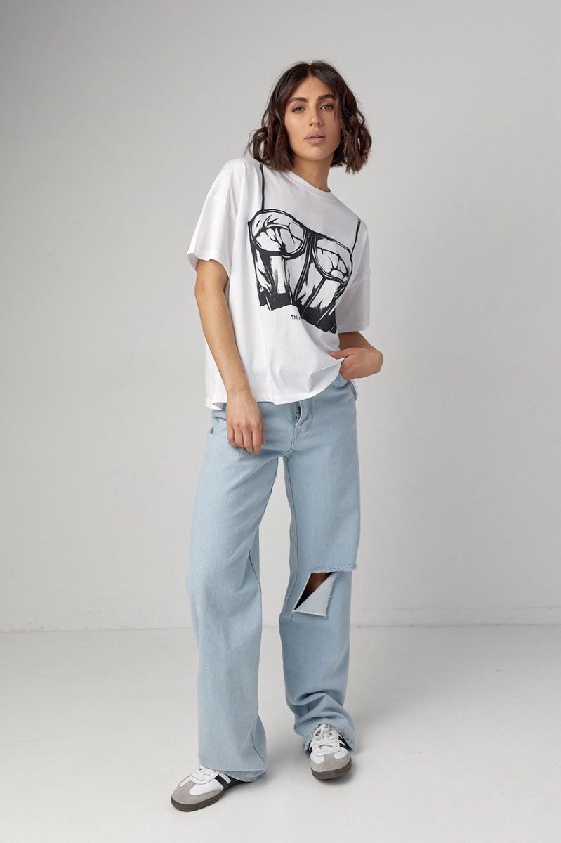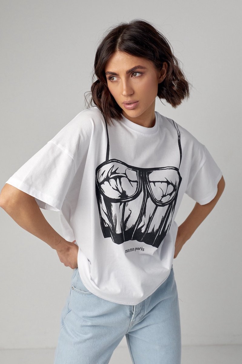 Спереди на футболке расположен принт в виде корсета, который придает изделию оригинальность и индивидуальность. Под низом принта находится лаконичная надпись, которая дополняет общий вид футболки, делая её более выразительной и запоминающейся.