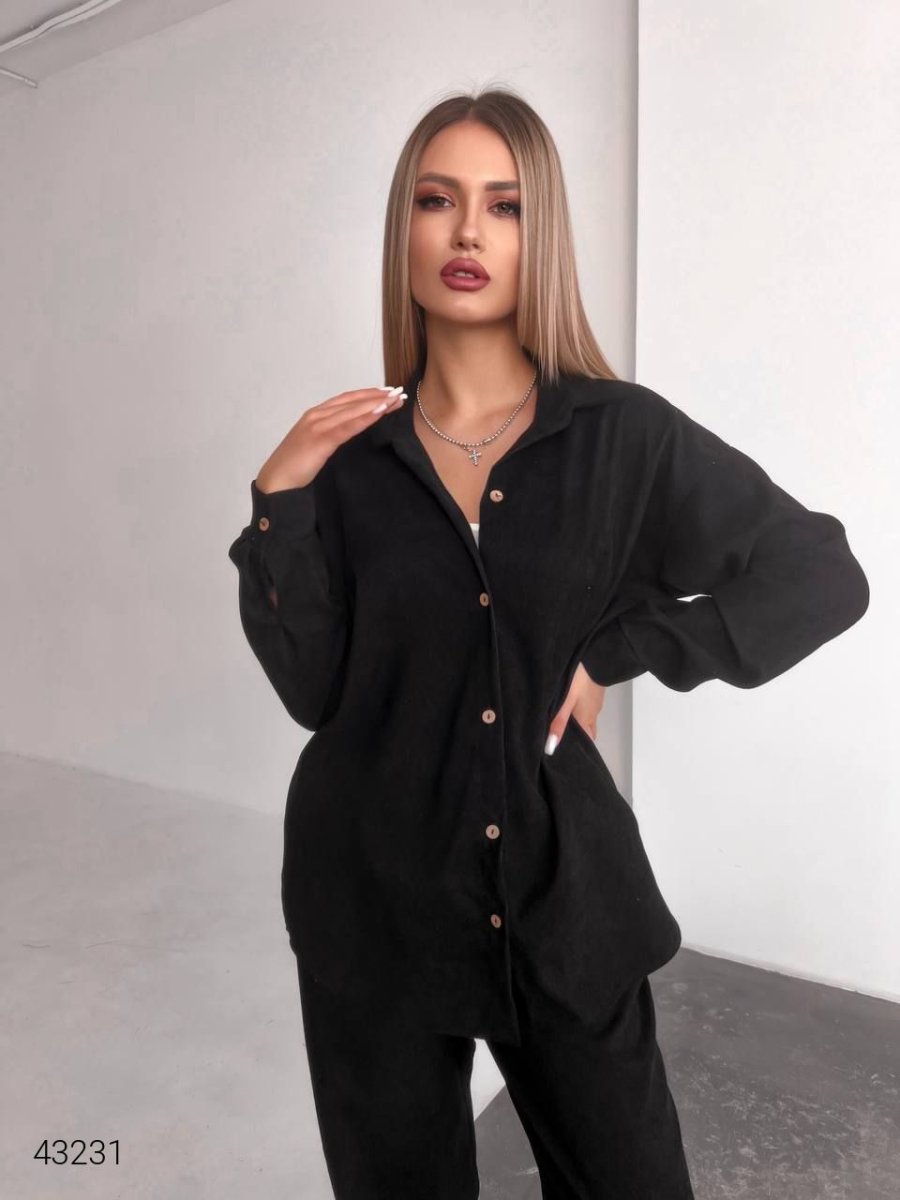Женский брючный костюм с рубашкой. Рубашка на пуговицах, рукава на манжете, штаны прямо, пояс на резинке.