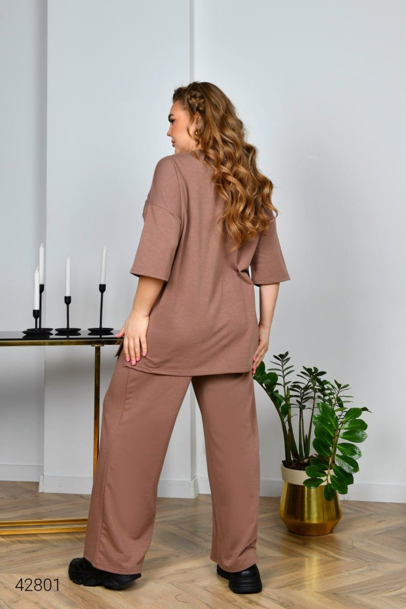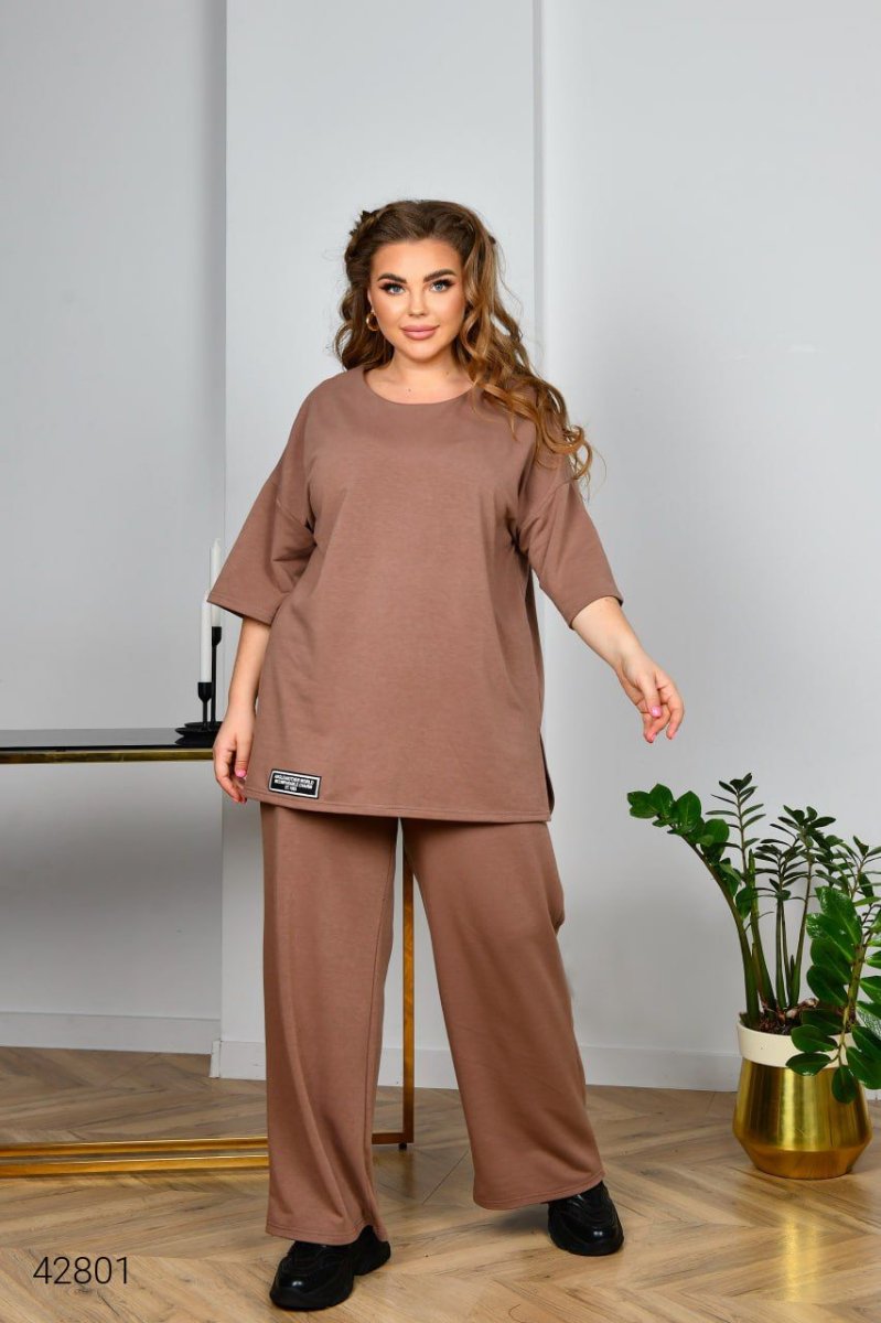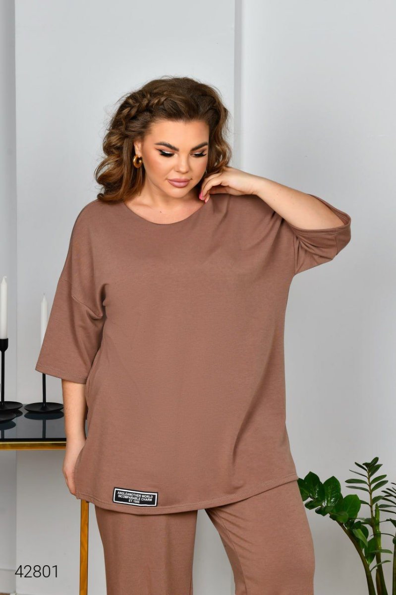 Женский костюм больших размеров. Туника прямого свободного силуэта. Вырез горловины круглый. Линия плеча спущена, рукав прямой, длиной 3/4. Низ оформлен двумя разрезами по бокам. Туника декорирована качественной нашивкой. Штаны прямого силуэта, по талии собраны на резинку. В боковых швах обработаны карманы.