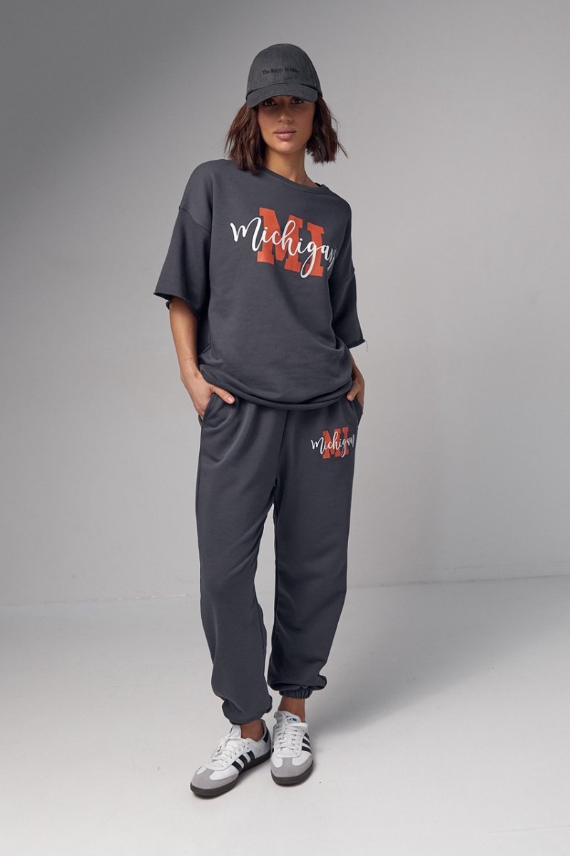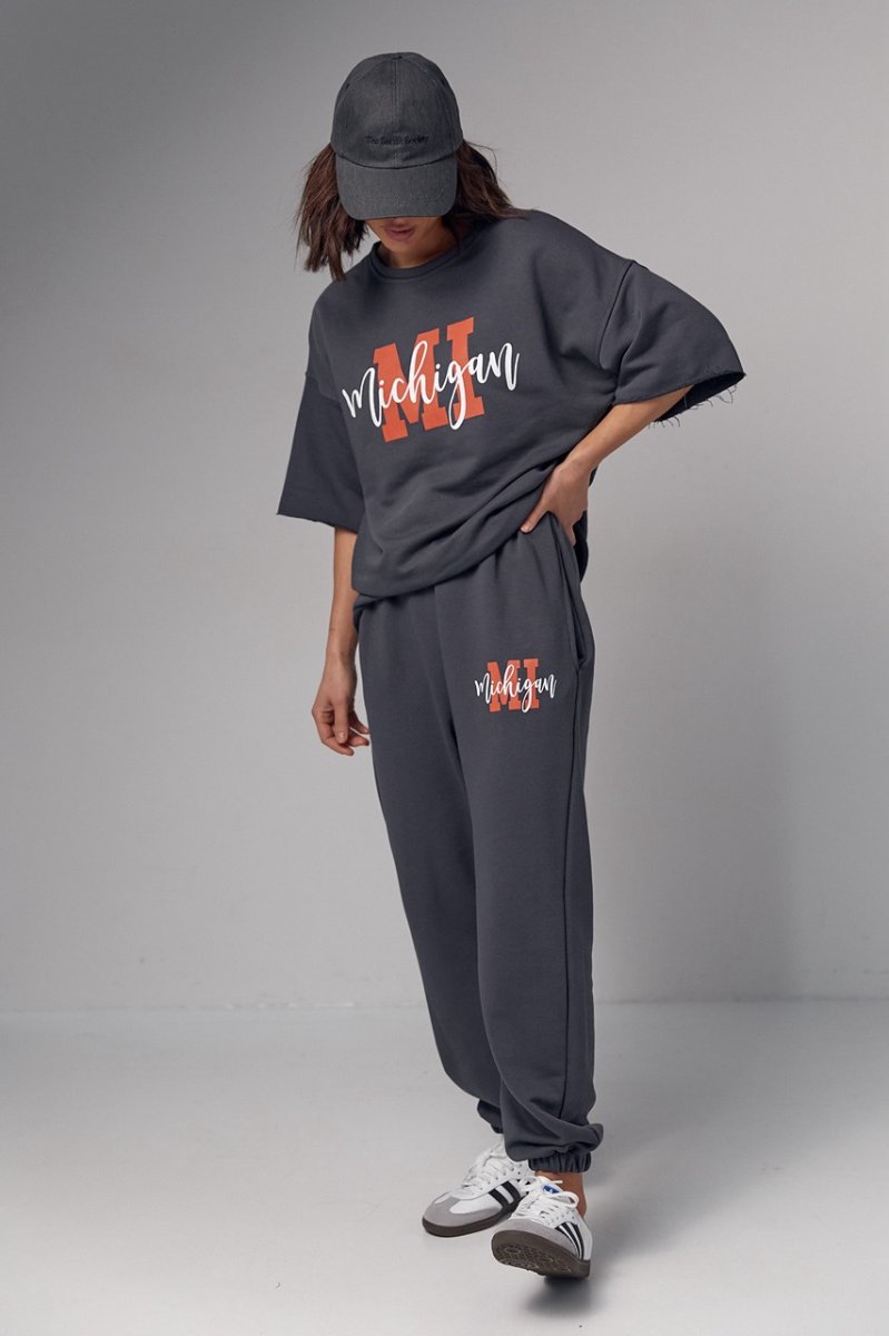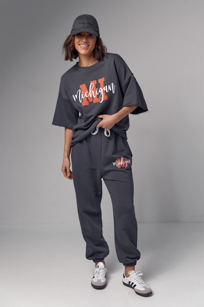 Модель состоит из удлиненной футболки и свободных джоггеров. Края рукавов и низ футболки не обработаны, что добавляет этому ансамблю непринужденности и неповторимости. Спереди на футболке нанесена надпись "Michigan", придавая ей изюминку и индивидуальность.