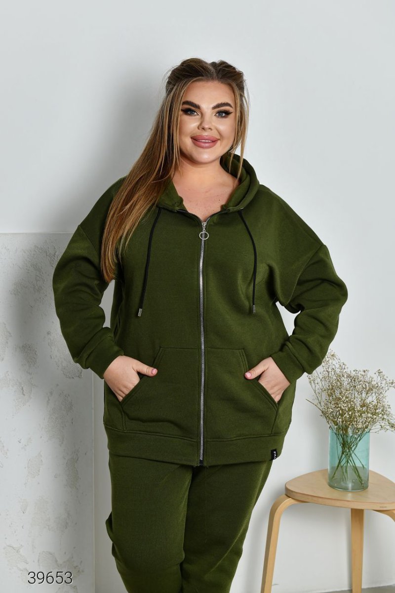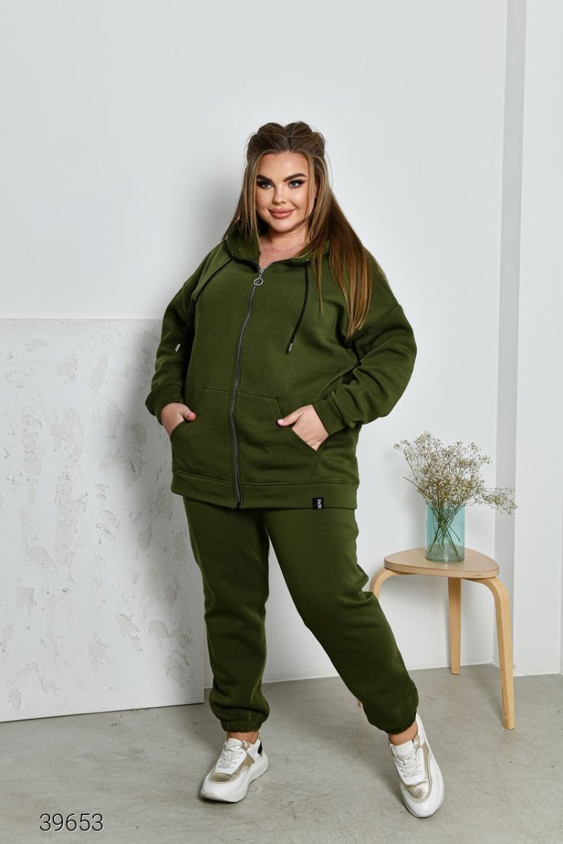 Женский теплый костюм. Кофта с капюшоном, в кулиску которого продет шнурок. Линия плеча спущена, накладные карманы «кенгуру». Штаны с посадкой выше средней. По талии на резинке. В боковых швах карманы. Низ штанин на резинке. Ткань: трикотаж трёхнить с начёсом.