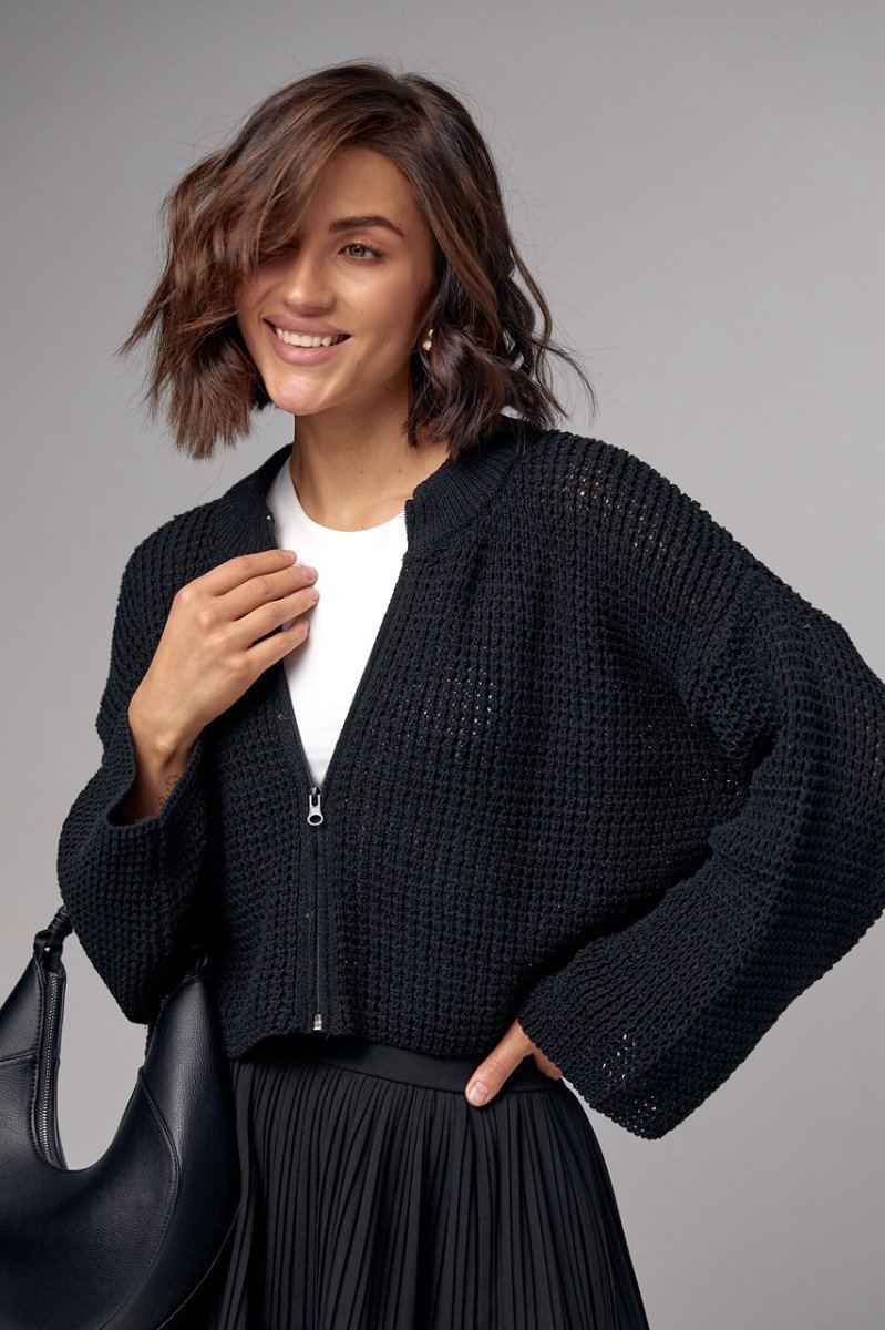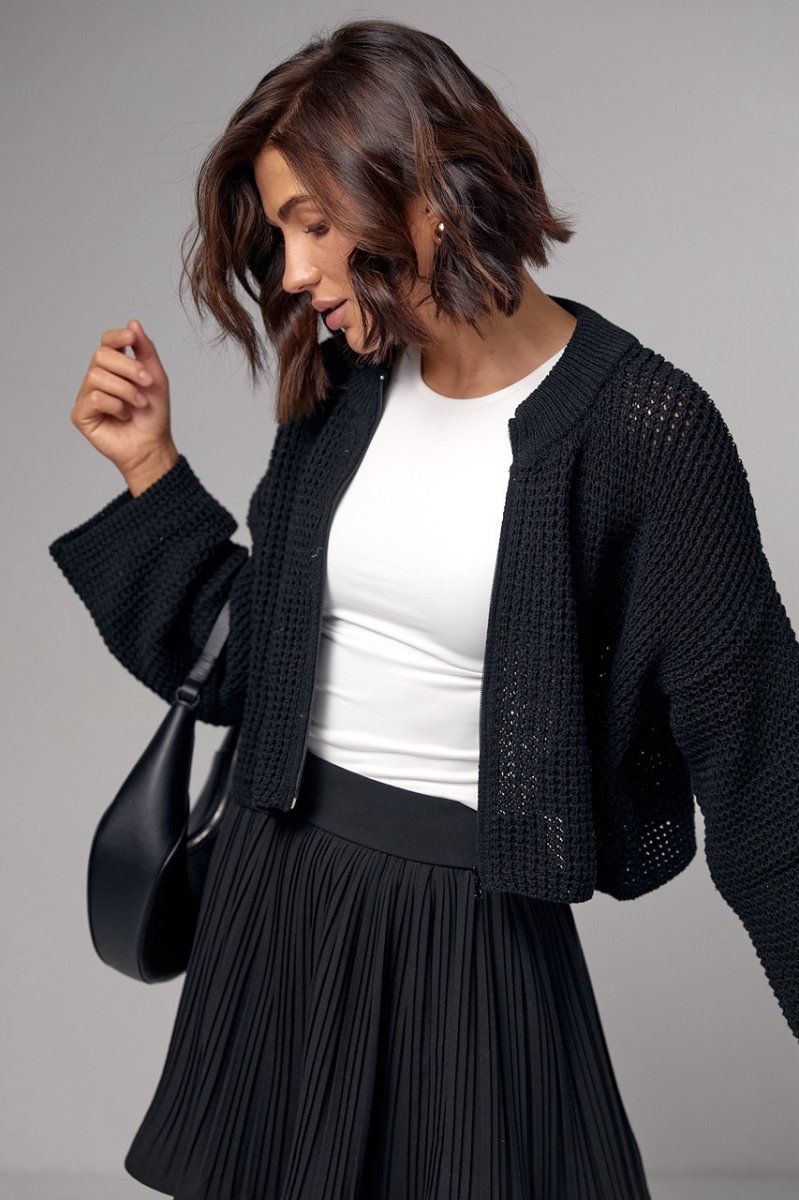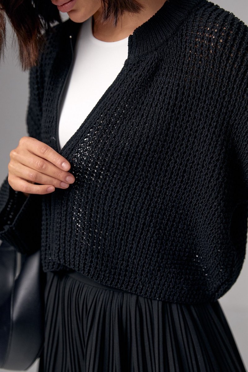 Модель полностью выполнена из машинной вязки и спереди застегивается на молнию. Круглая горловина обшита вязаной окантовкой, а длинные рукава имеют разширенный фасон. Линия плеча слегка опущена.