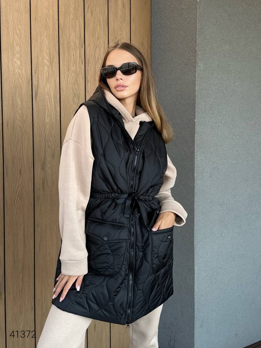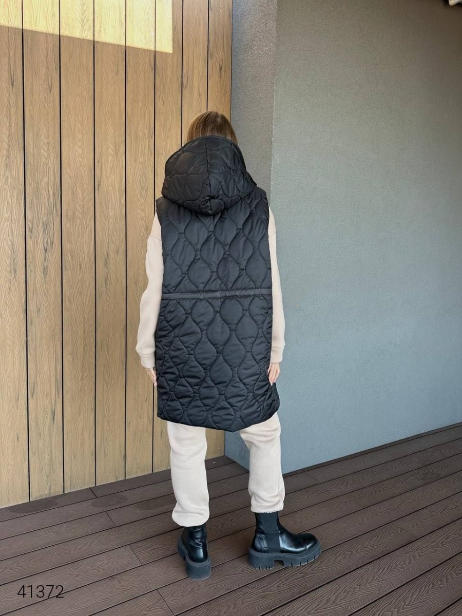 Жилет женский удлиненный с капюшоном. Свободный крой, талия на кулиске. Имеет удобные накладные карманы с клапанами на кнопках. Ткань: плащевка стёганая с подкладом, утеплитель 150 г.м2. Один универсальный размер 42-48.