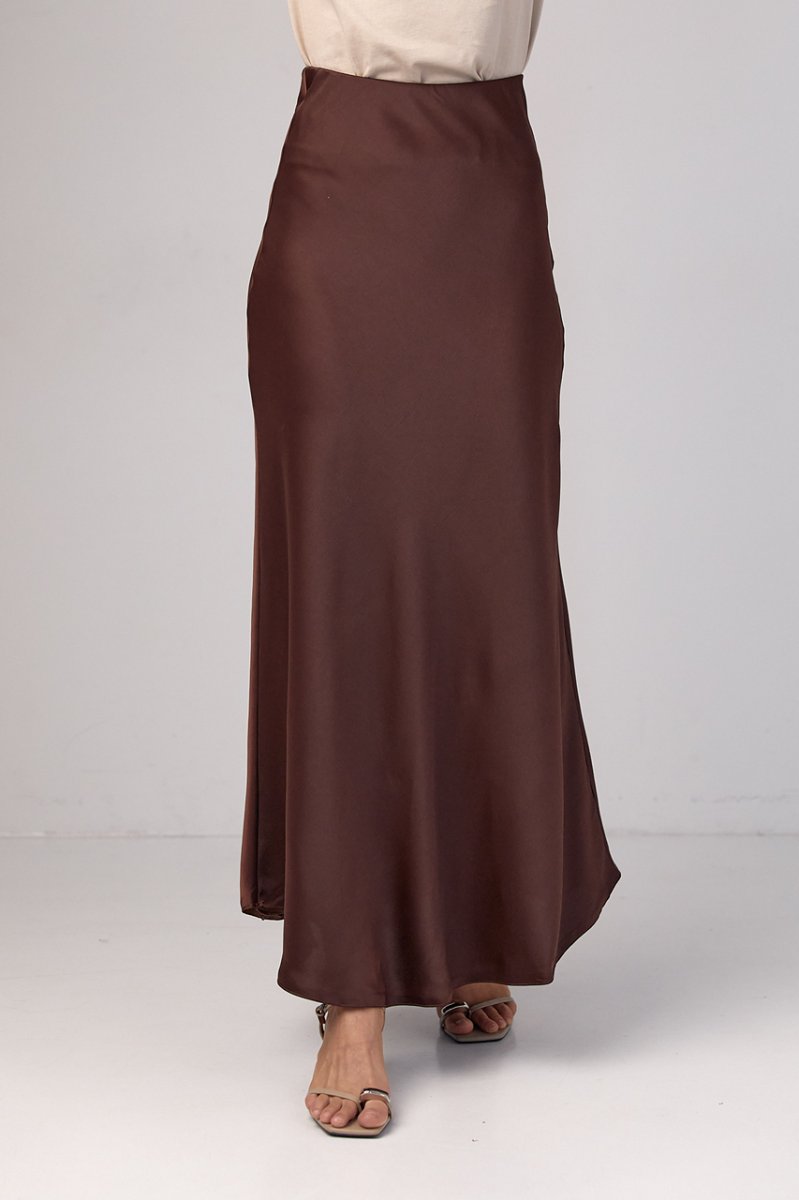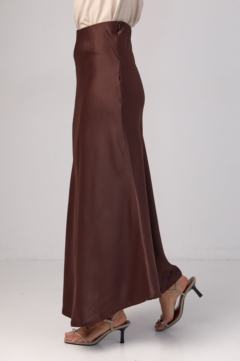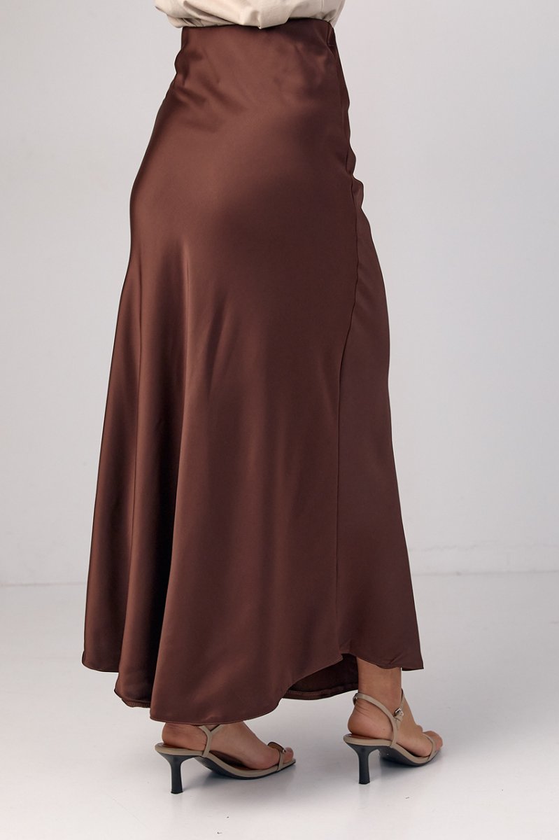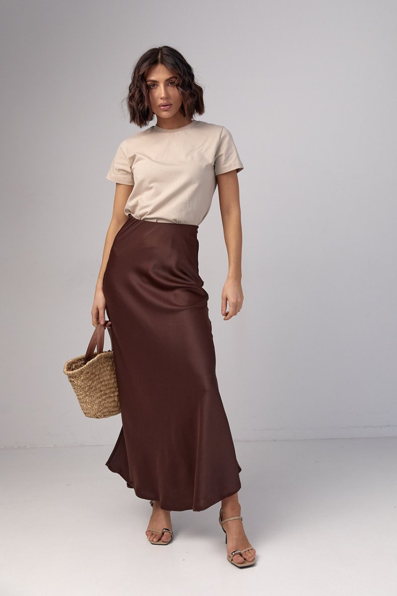 У моделі низ прямий, верх доповнений резинкою, яка вшита у внутрішній частині спідниці. У лівому бічному шві вшита коротка блискавка. Спідниця зшита із щільного атласу, який гарно переливається у променях світла.