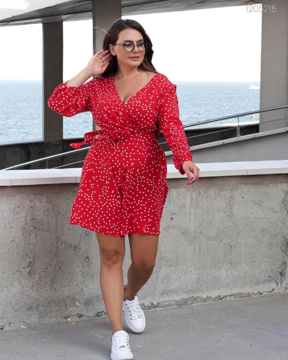 Деталі: А-силует, глибоке декольте, рукав довжиною 3/4 з манжетою на гудзику, пишна спідниця-шорти, бічні кишені. Комбінезон застібається на блискавку, пояс вшитий.