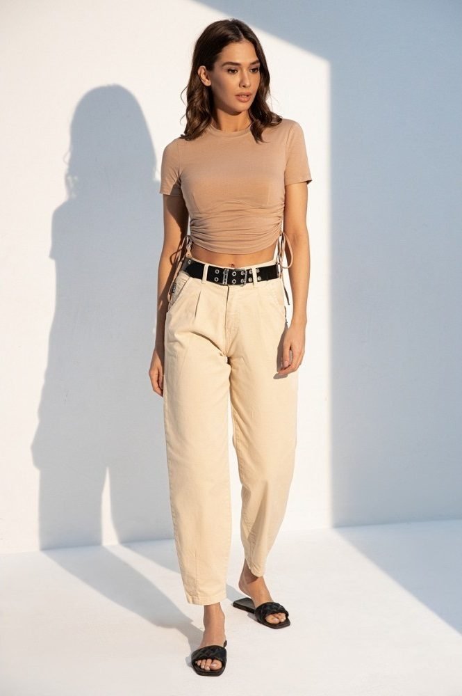 Короткий топ з трикотажу віскози з драпіруванням і зав'язками збоку. Модель облягаючого фасону з округлим вирізом горловини. Родзинкою моделі є фігурний шов, що підкреслює лінію грудей. Топ ідеально підійде для дружніх вечірок, посиденьок в кафе, прогулянок по місту.