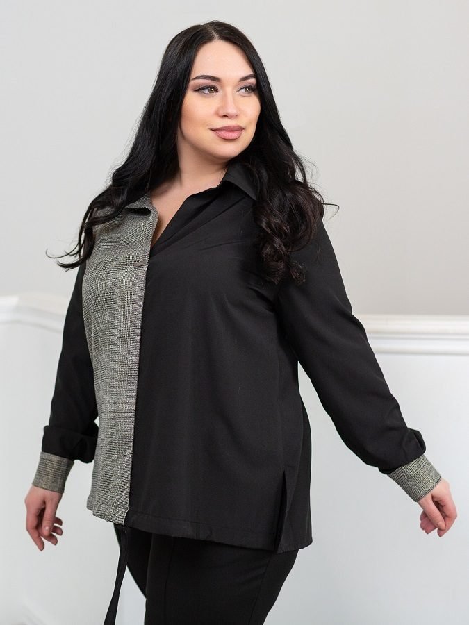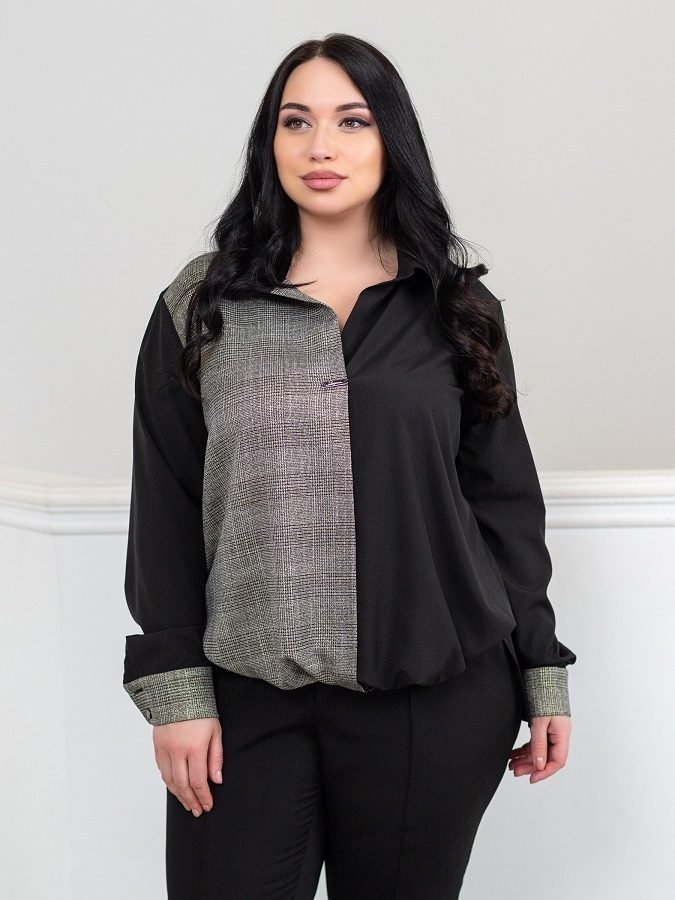 Легка блуза вільного крою гармонійно поєднується практично з будь-яким низом. Поличка виконана в стилі печворк , одна сторона - софт, інша - костюмна тканина в клітку з незначним включенням золотистого люрексу. V-подібний виріз горловини доповнений декоративним елементом з найменуванням бренду. Манжети рукавів застібаються на гудзики. У бічних швах неглибокі розрізи. Спинка злегка подовжена. Низ полички з куліскою на зав'язках.