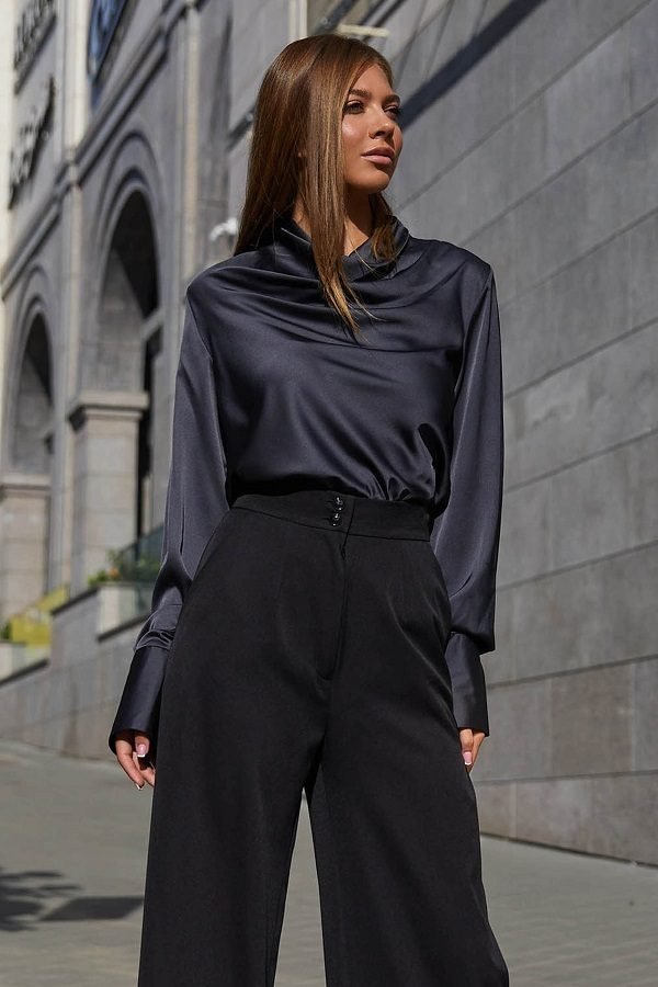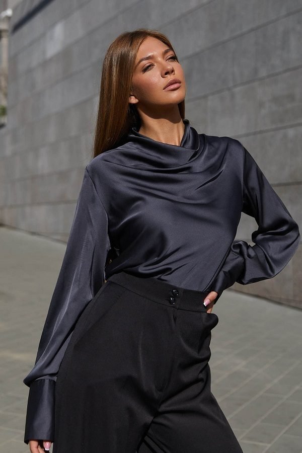 Красива блуза з шовкової тканини. Горловина виробу виконана в стилі хомут створюючи на грудях розкішні хвилі з блиском тканини. Довгий рукав з високим манжетом застібається на гудзик додає легкості. Модель відмінно комбінується з брюками і спідницею, надаючи образу ділового або вечірнього стилю.