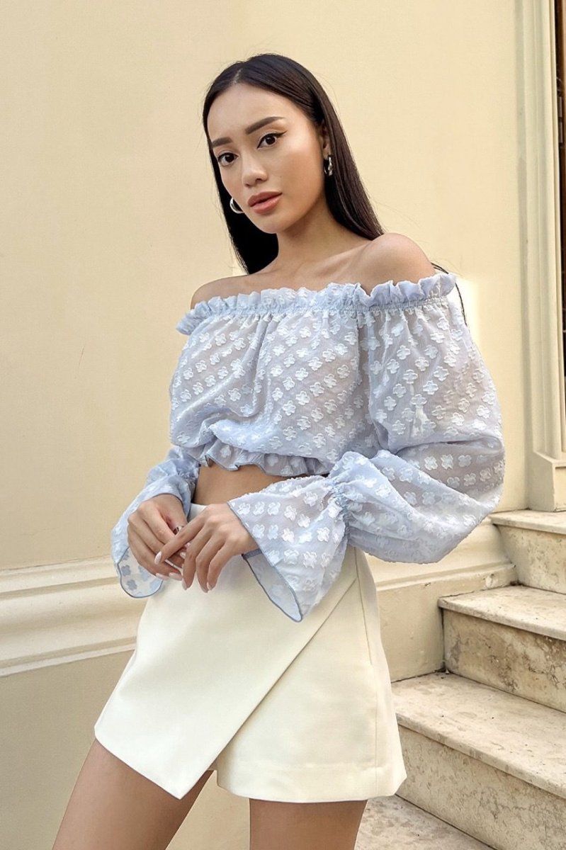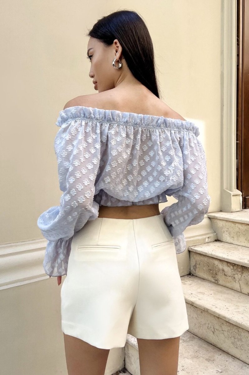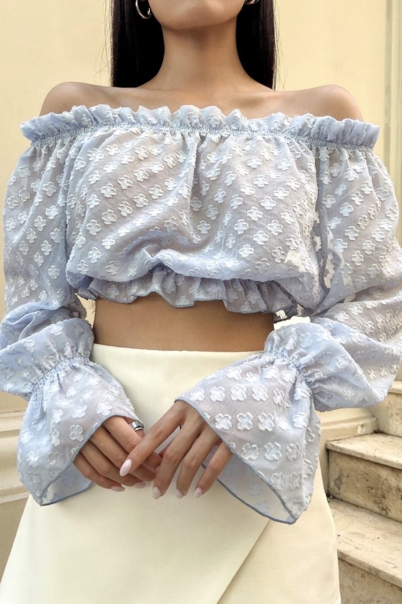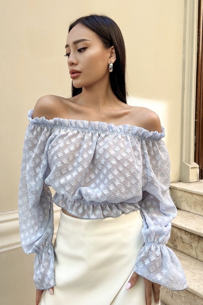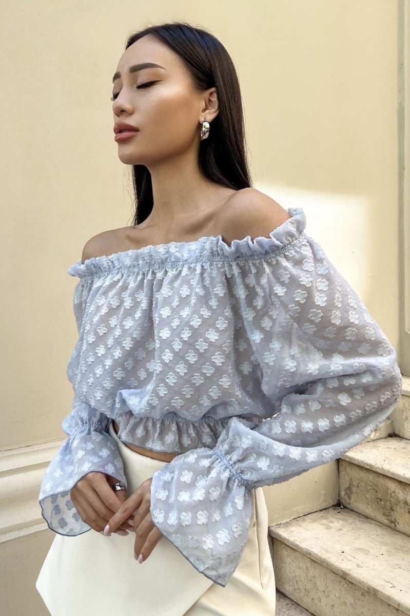 Трендова блуза укороченого крою, виготовлена із легкого напівпрозорого шифону у ніжних літніх кольорах. Модель відрізняється глибоким вирізом-човен з еластичними вставками, що дозволяє відкривати плечі. Ефектний довгий рукав з воланом та декор рюшами – одні з найактуальніших деталей SS22.