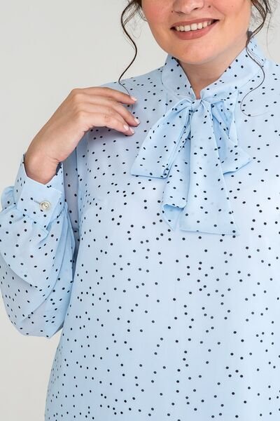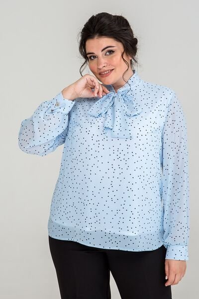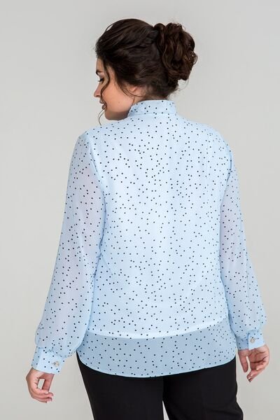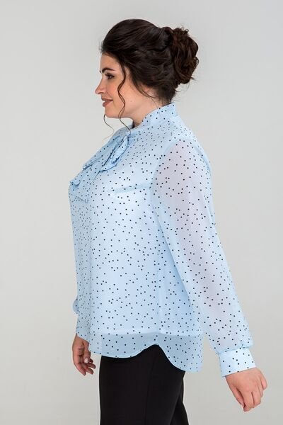Блузка з шифону вільного силуету. По переду нагрудні виточки. Комір - стійка із зав'язкою. Рукав одношовний втачний, на манжеті з застібкою на петлю і гудзик. Гармонійно виглядає зі спідницею і з брюками.