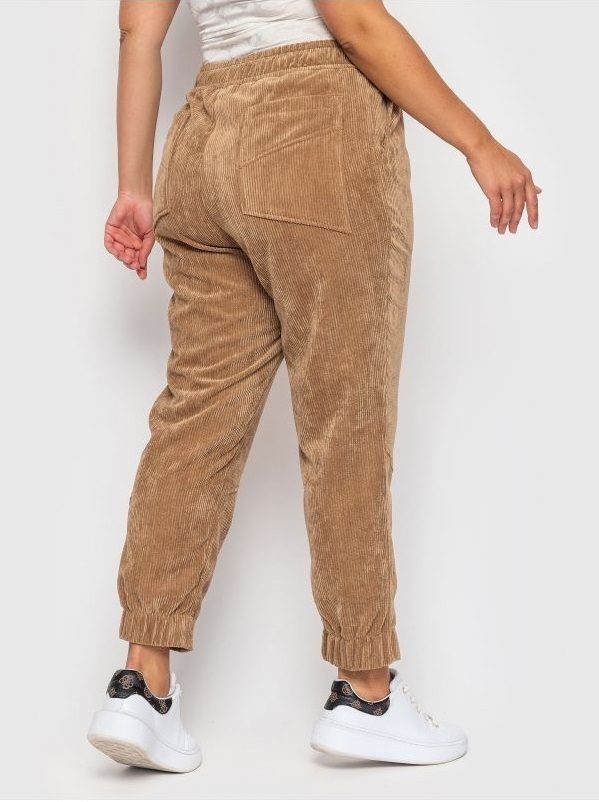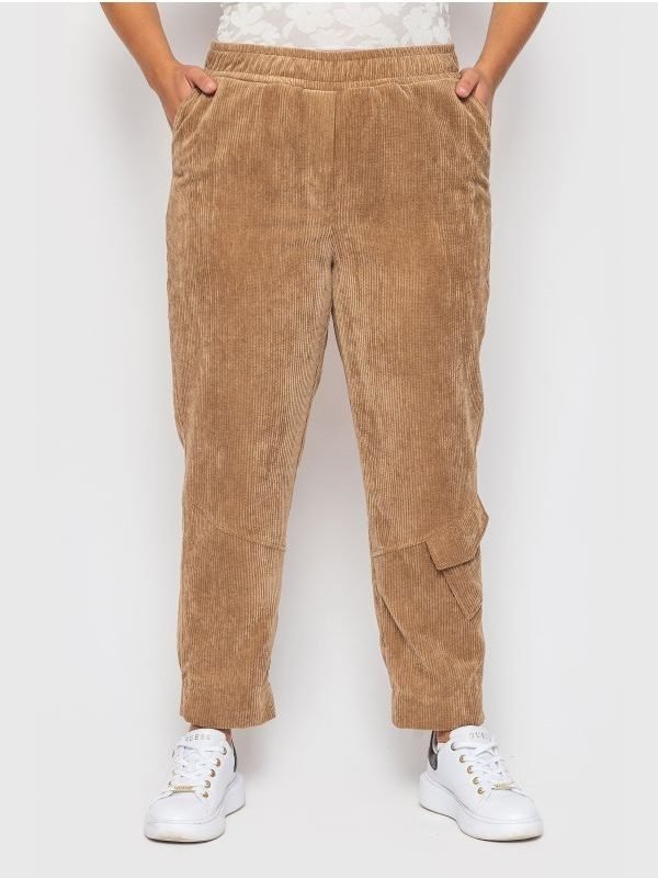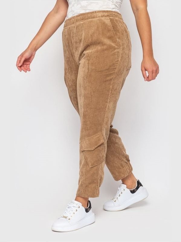 Стильні укорочені брюки високої посадки. По талії проходить широкий пояс на гумці, з боків косі кишені. Ззаду передбачені накладні кишені. На брюках є декоративні строчки і накладна кишеня з клапаном. Ззаду манжета брюк на гумці, що гарантує їх щільне прилягання до ноги.