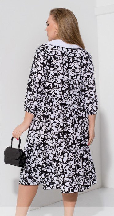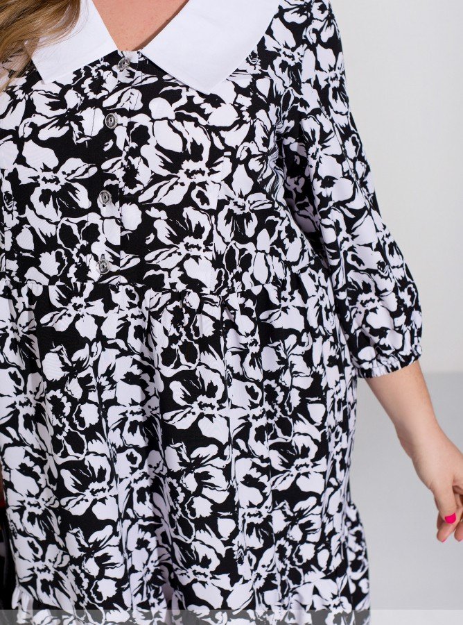 Ця чарівна сукня міді привертає увагу своїм грайливим квітковим принтом та стильним контрастним воротником, який є трендом 2024. Застібається на ряд гудзиків, які розташовані на планці до відрізної лінії талії, надаючи образу елегантність та оригінальність. Рукава завершуються на 3/4, а низ сукні прикрашений воланом, що додає легкості та грайливості. Ця сукня- ідеальний вибір для створення трендового та жіночного образу.