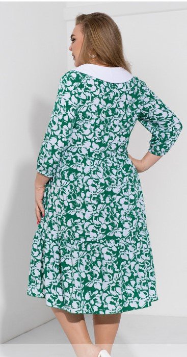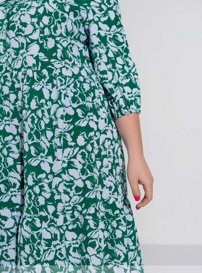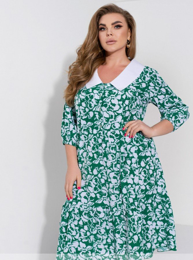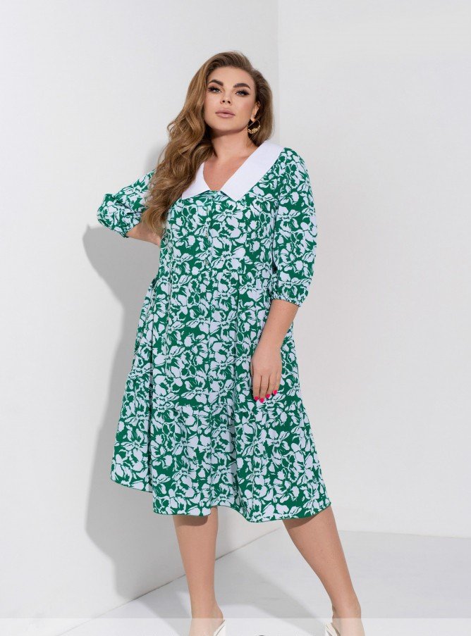 Ця чарівна сукня міді привертає увагу своїм грайливим квітковим принтом та стильним контрастним воротником, який є трендом 2024. Застібається на ряд гудзиків, які розташовані на планці до відрізної лінії талії, надаючи образу елегантність та оригінальність. Рукава завершуються на 3/4, а низ сукні прикрашений воланом, що додає легкості та грайливості. Ця сукня- ідеальний вибір для створення трендового та жіночного образу.