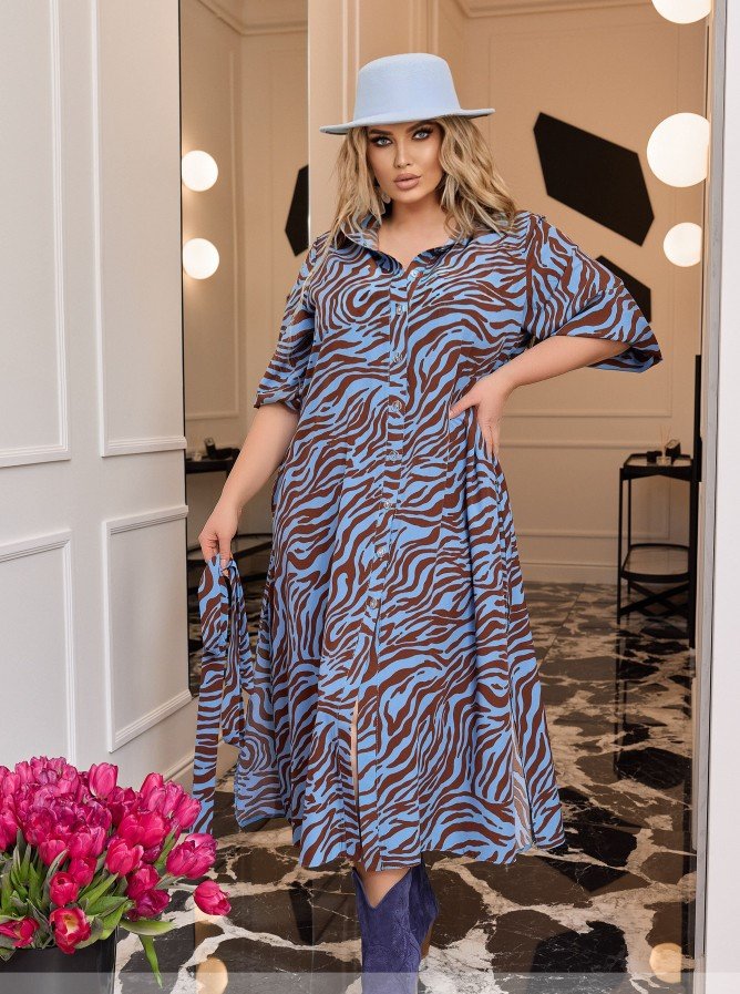 Чарівна сукня-сорочка вільного крою, спереду застібається на гудзики по всій довжині, що додає невимушеності та стилю образу. Текстильний пояс підкреслює талію, а кишені з боків надають практичності. Розрізи з обох сторін внизу додають елегантність та зручність. Модний принт робить цю сукню-сорочку стильним вибором для сучасної жінки.