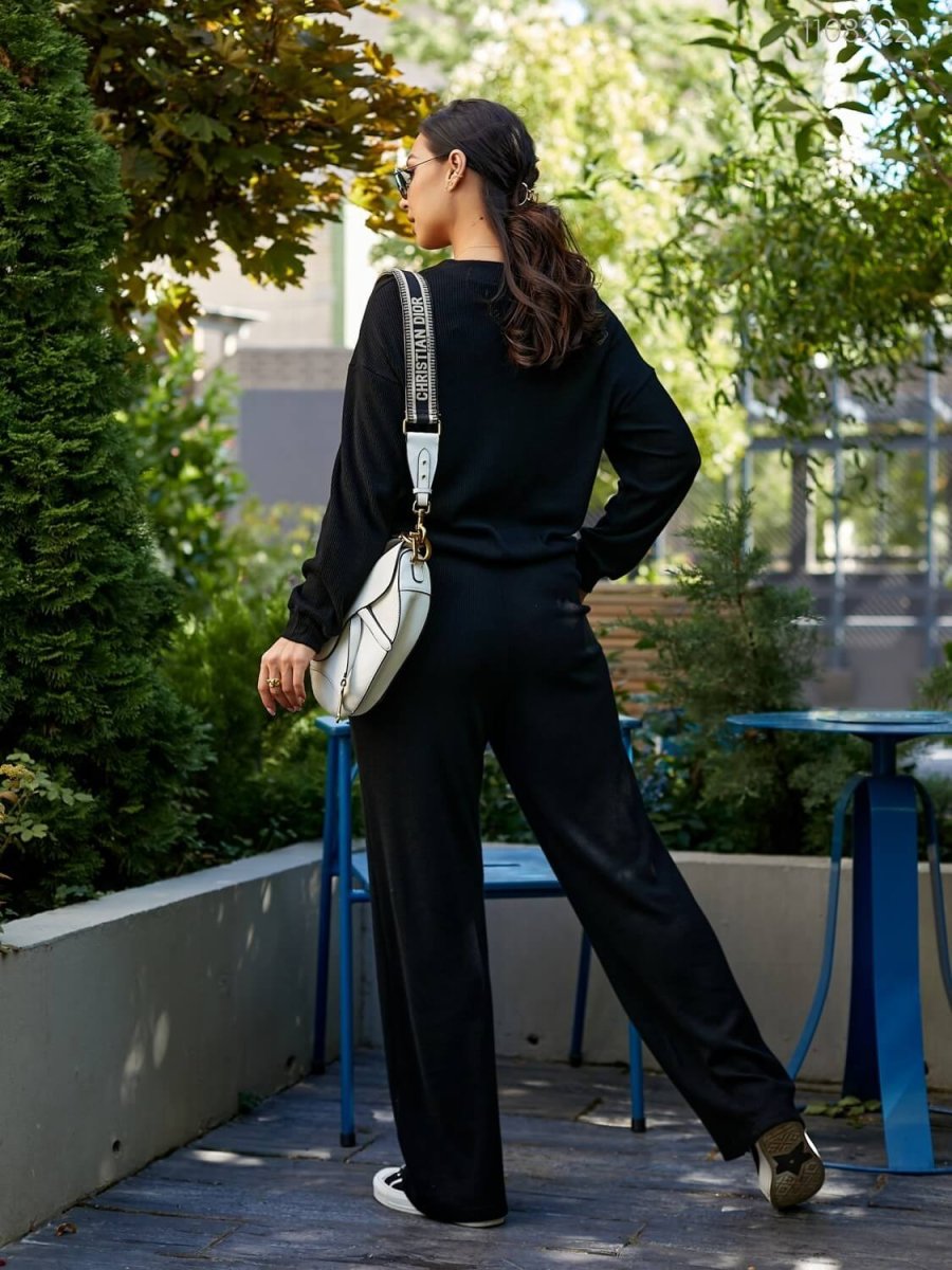 Деталі: Кофта з довгим об'ємним рукавом, заниженою лінією плеча, із застібкою на гудзики. Розкішні довгі штани-палаццо з кишенями в бічних швах, з поясом на широкій резинці з куліскою.