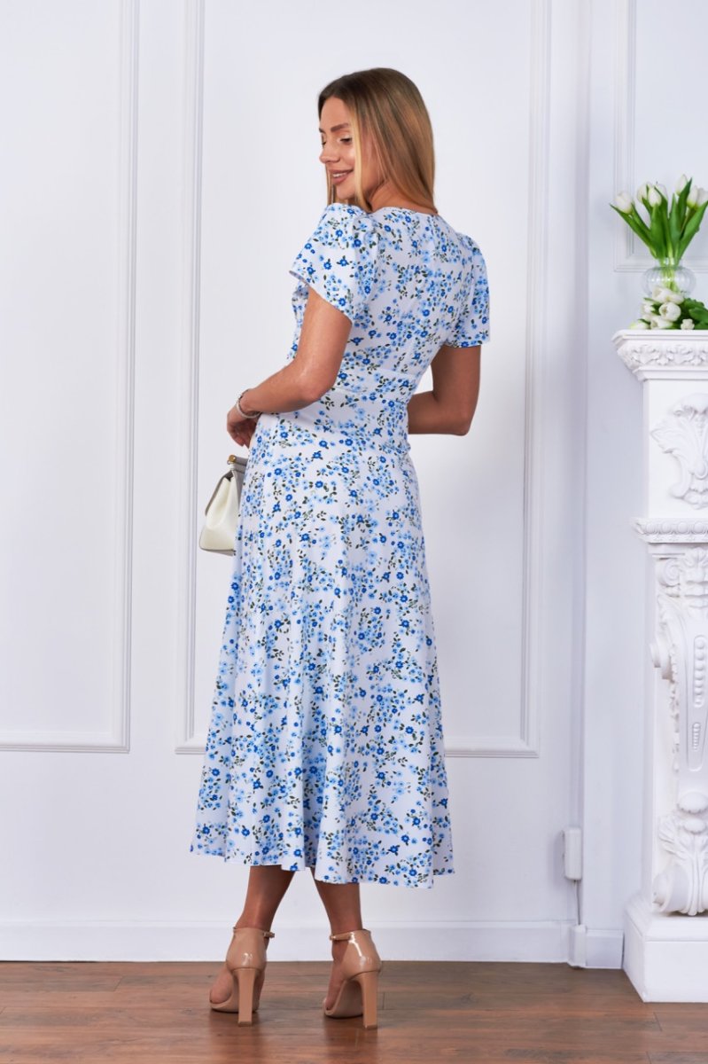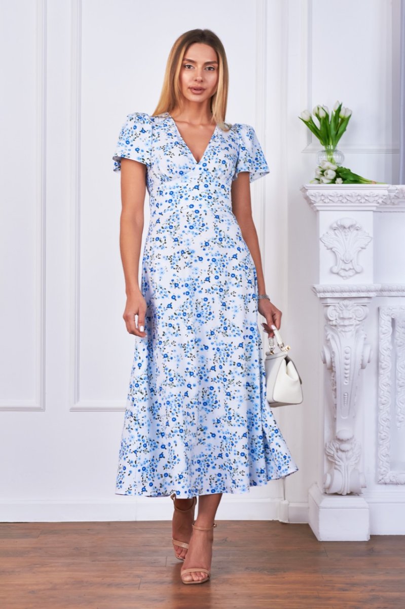 Ця чарівна сукня з легкої літньої тканини має рукава-крилушки та імітацію корсету по талії. V-подібний виріз декольте надає привабливості лінії груді. Ця модель підкреслить жіночність та елегантність. Вона ідеальна для особливих випадків та святкових заходів.