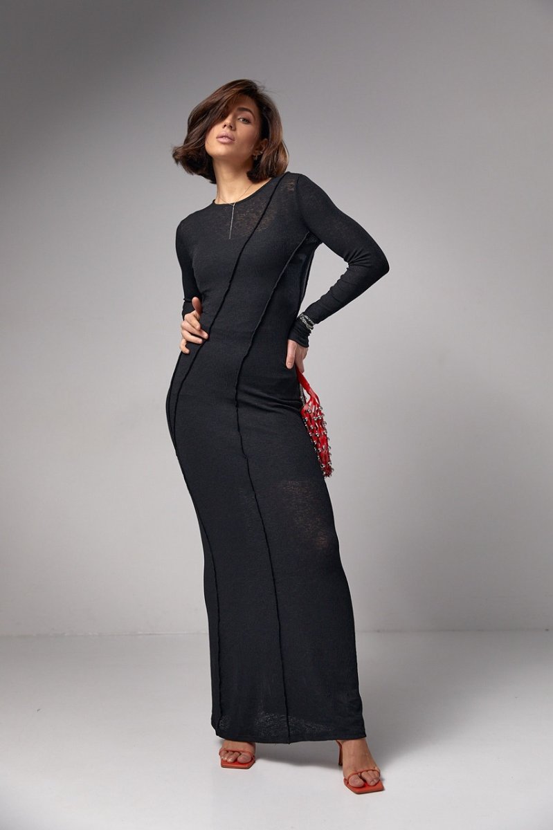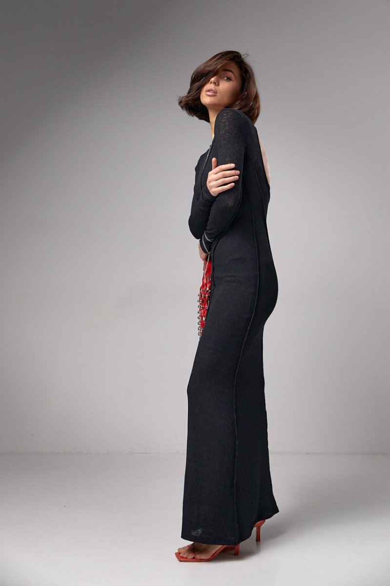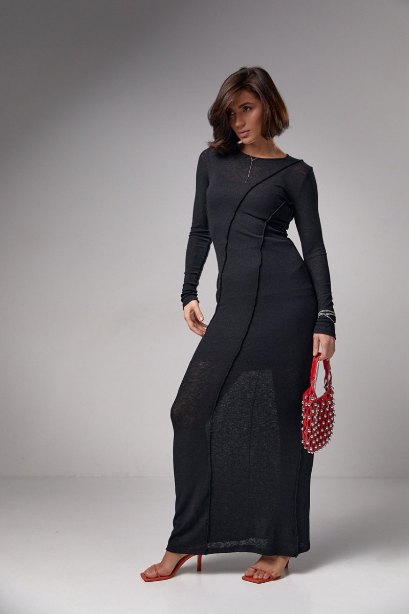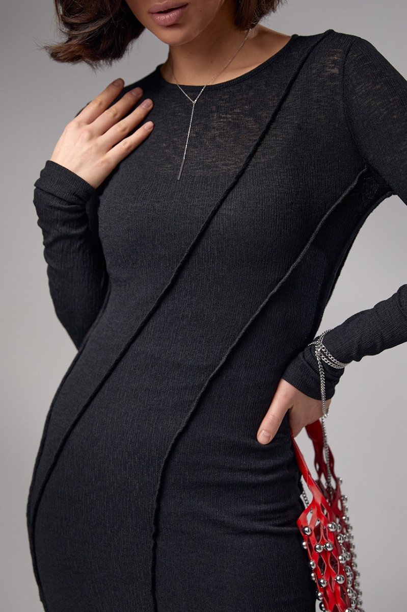 Модель повністю зшита з напівпрозорої тканини з ефектом плісування, а під низом доповнена укороченою еластичною підкладкою у вигляді сарафану (виріб не вшитий). Краї низу та рукавів у виробі прямі. Кругла горловина ззаду застібається по центру на ґудзичок із петелькою із резинки, від якої опускається круглий виріз. Передню частину сукні прикрашають два додаткові вертикальні шви, виведені назовні.