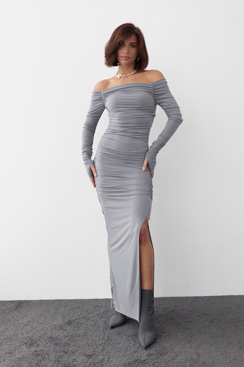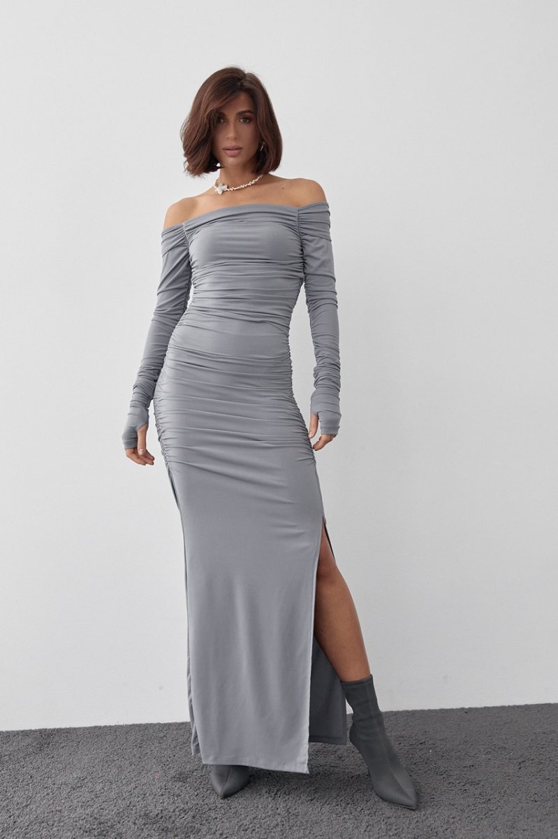У моделі довжина максі та з лівого боку низ доповнений високим розрізом. Бічні шви основної частини виробу та рукава доповнені драпіруванням на резинці. Низ рукавів має розріз для великого пальчика. Верх сукня з відкритими плечима і доповнений короткою підкладкою з основної тканини.