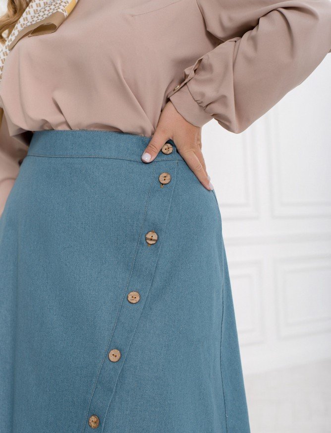 Жіночна джинсова спідниця міді стане вашим фаворитом в цьому сезоні завдяки комфорту і універсальності, які вона подарує вам. Модель на резинці, вшитій в пояс по спинці, застібається на ряд гудзиків спереду, а також доповнена зручними кишенями в бічних швах.
