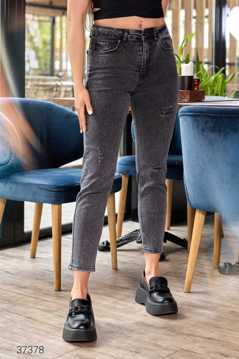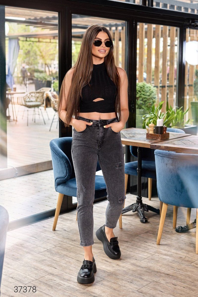 Джинси з рваним оздобленням. Завищена талія, шльовки, бокові кишені, накладні кишені ззаду, оброблений нижній край. Прихована ширінка із застібкою на блискавку та ґудзик. Тканина: стрейч джинс (лайкра + бавовна).