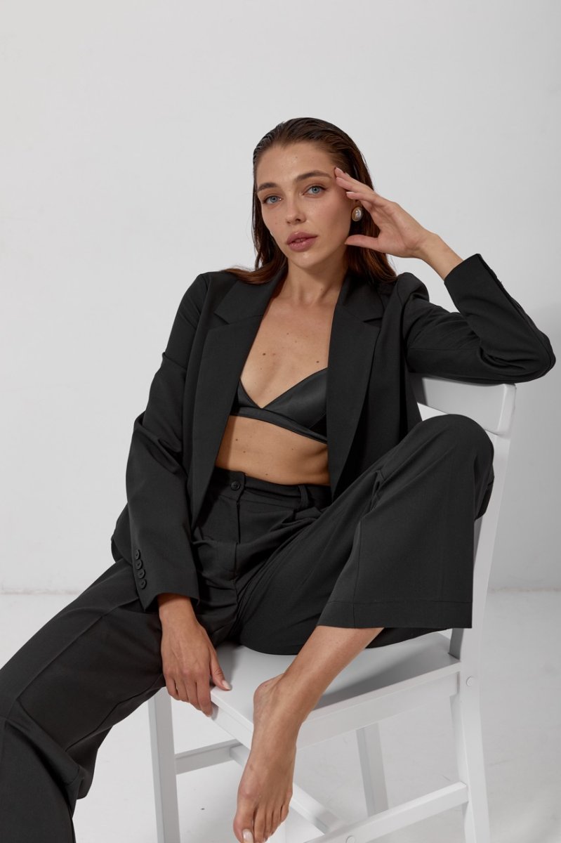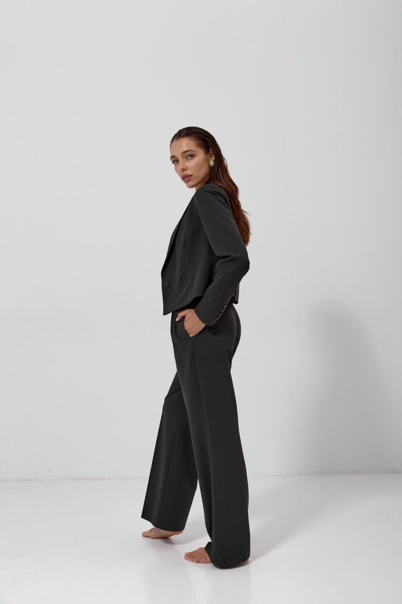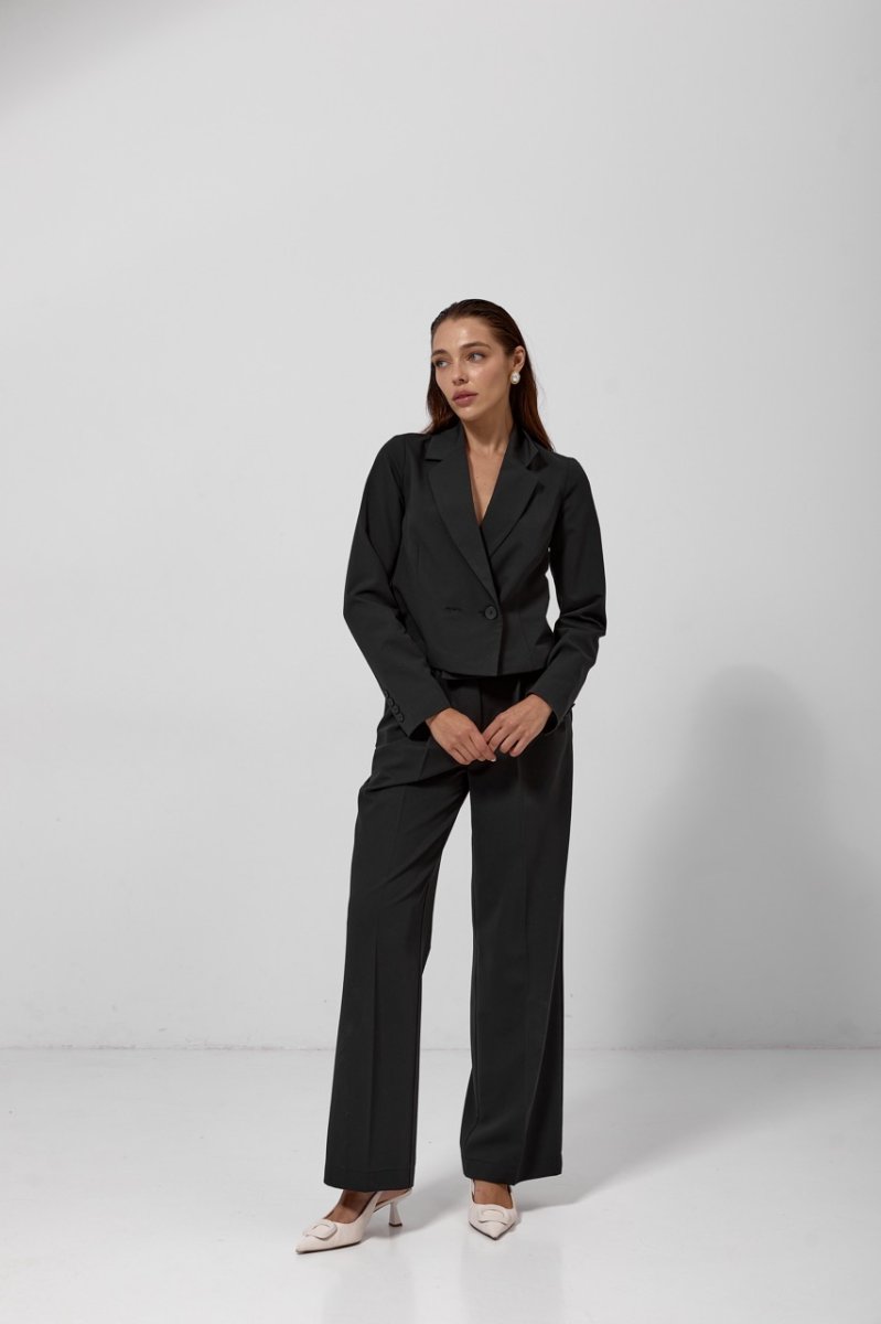 Класичний костюм укорочений жакет, брюки палаццо. Жакет з двубортною застібкою, комір піджачного типу. Пілочка із декоративною кишенею, з талієвими виточками. Рукава втачні, довгі, двухшовні, по низу шлиця і гудзики. Брюки палаццо прямого крою. На талії шльовки для зйомного поясу. Застібка: гудзик і прихована молнія. Передні половинки зі стрілками і складками. Кишені знаходяться в бічних швах. Задні половинки із виточками.