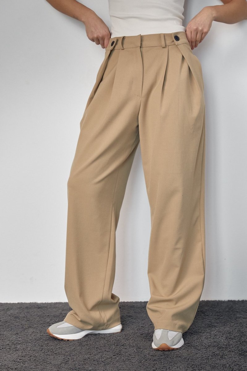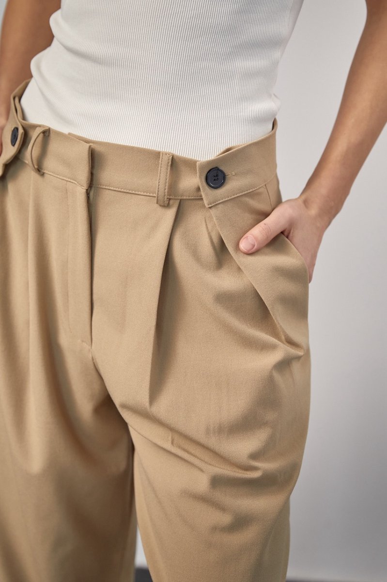 У цій моделі краї низу прямі, а втачний пояс йде без резинки та з петлями для ременя. Застібається виріб на два потаємні гудзики та на блискавку. Також на поясі пришиті два декоративні гудзики, які фіксують бічний нахльост і таким чином формує складку. Ззаду угорі є вертикальні виточки. Для більшого комфорту штани мають прорізні кишені.