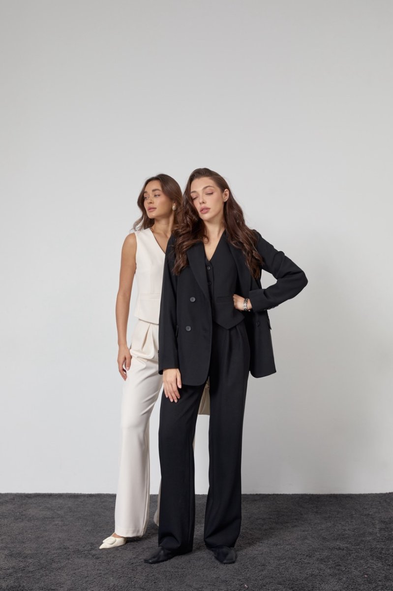 Класичний костюм  - трійка: піджак, жилет, брюки палаццо. Піджак двубортний, на підкладці, довжиною нижче лінії стегон. Рукава вшивні, довгі, двушовні з гудзиками на імітованій шліці. Кишені прорізні із обшивками. Комір піджачного типу, що застібається на гудзики, низ краю борту заокруглений. Жилет класичний, без рукавів. Штани прямого крою На талії шльовки для зйомного поясу. Застібка: гудзик і прихована молнія. Передні половинки зі стрілками і складками. Кишені знаходяться в бічних швах. Задні половинки із виточками.
