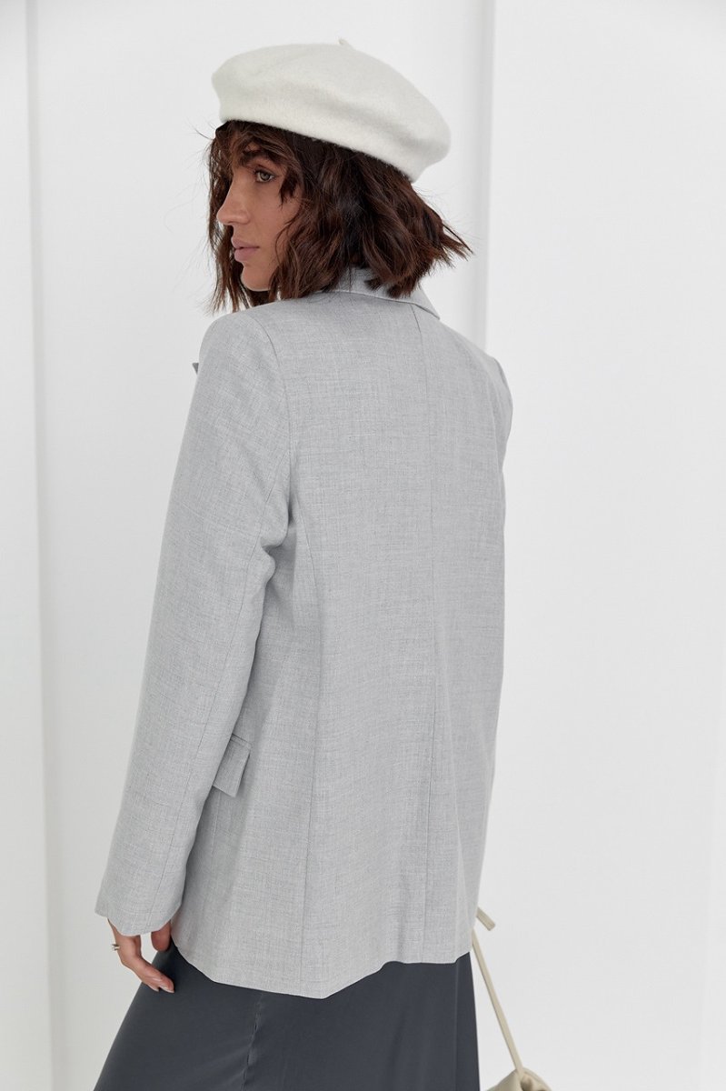 Ця модель з англійським воротником йде на підкладці та з поролоновими плічками без застібки. Краї низу прямі, рукави довгі. Спереду розташовані прорізні кармани з клапанами, які всередині по центру закріплені спеціальним рядком (для використання карманів рядок необхідно акуратно розпороти).