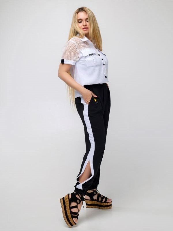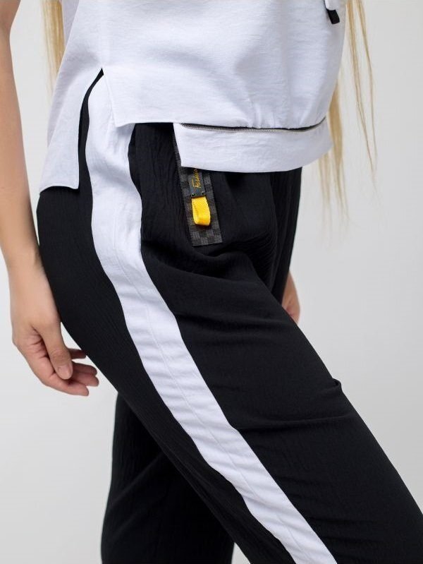 Брюки вільного крою, з лампасами з тканини контрастного кольору і вирізами в нижній частині. Манжет на резинці. Пояс зі знімним декоративним елементом. Спинка пояси з еластичного матеріалу.