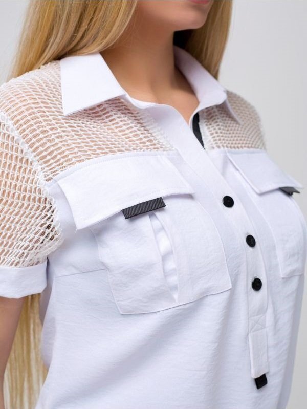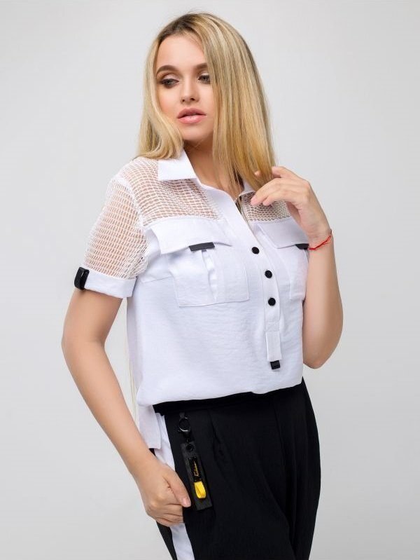 Жіночий комбінезон-трансформер з дихаючого, комфортного матеріалу. Блуза з брюками з'єднується блискавкою. Блузка з коміром сорочкового типу, кокетка, рукави оформлені сіткою. Застібається на поличці на гудзики. Доповнюють виріб накладні кишені з клапанами. Спинка злегка подовжена, з боків розрізи.