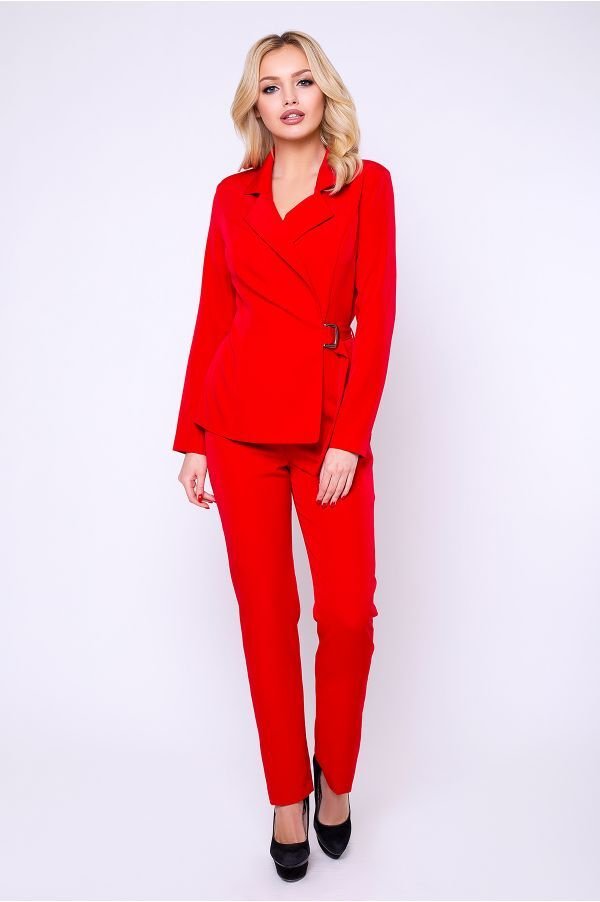 Комбінезон Росаріо в червоному кольорі стані вашим самим ефектним вбранням! Верх комбінезона являє собою імітацію піджака з відкладним коміром. Модель на подплечниках. Застібається на захід за допомогою вшитого пояса. Штани злегка завужені до низу. В бічному шві передбачений прорізної кишені з листочками. Застібається комбінезон по центру спинки на потаємну блискавку.