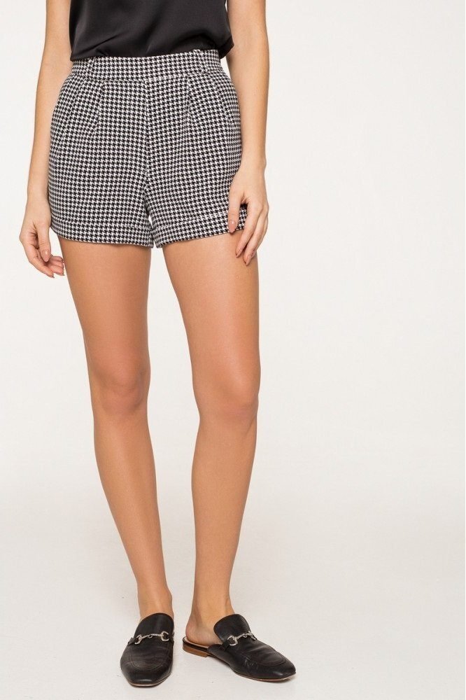Комфортні шорти з бічними кишенями і відворотом по низу в модний принт "гусяча лапка". Застібаються на потаємну блискавку збоку.
