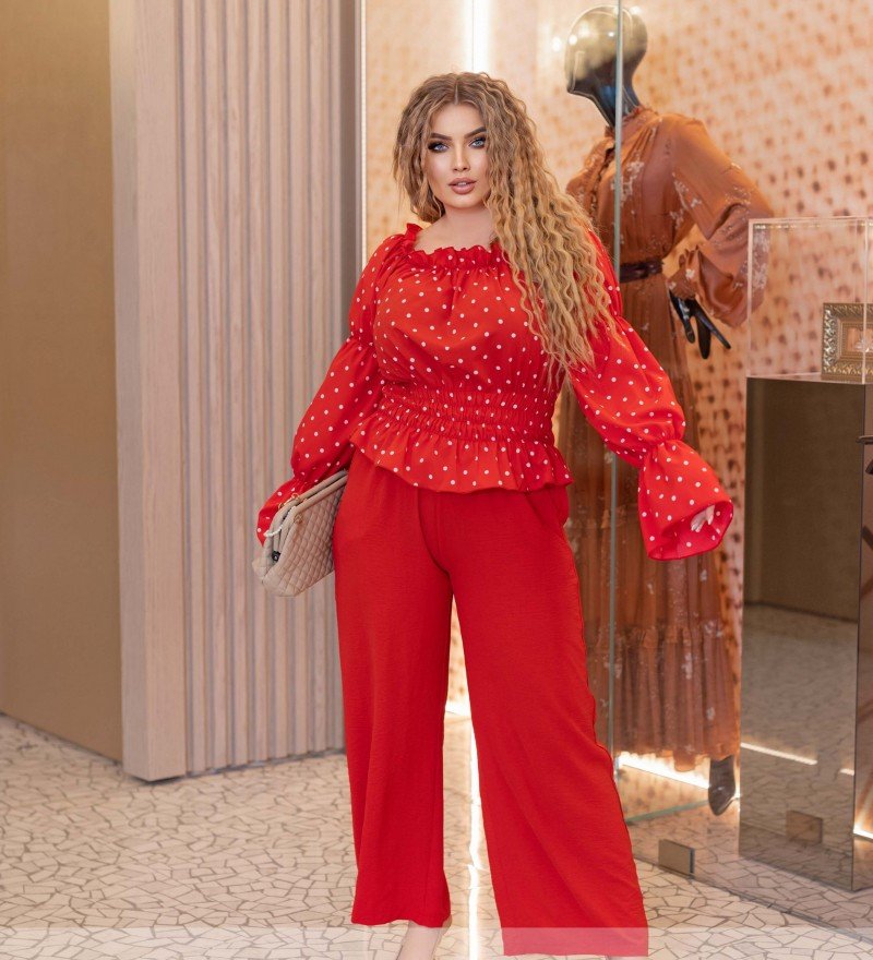 Неймовірний костюм, який підкорив наше серденько та впевнені, що зачарує й Вас. Складається він з блузи із довгим рукавом та базових брюк широкого крою. Розкішна блуза з горловиною, яка виготовлена в формі човника з гумкою, яка створює невеликі волани, що додають виробу легкості та жіночності.