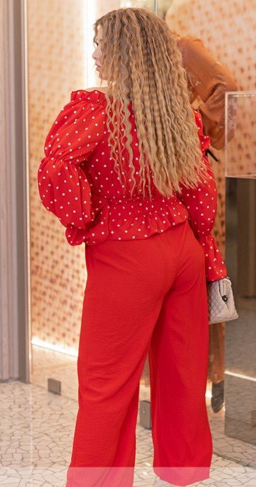 Рукава блузи доповнені гумкою, що додає стильний акцент та створює ефектний волан на зап'ястях. Талія виділена широкою гумкою, що створює красивий ефект та робить силует більш підтягнутим. Блуза також доповнена воланом знизу, що доповнює композицію. Брюки з кишенями з боків доповнюють цей костюм своєю лаконічністю, створюючи елегантний, але такий простий водночас образ.